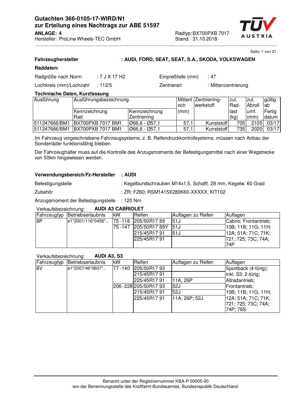 Felgengutachten / ABE für Alufelgen Proline BX700PXB.7017 (7Jx17 ET 0, Mittenloch 0 mm) mit KBA 51597 (Zertifikatsnummer KBA 51597). Hier kostenlos als PDF herunterladen. Der Download-Link ist 24 Stunden gültig und kann bis zu zwei Mal verwendet werden.
