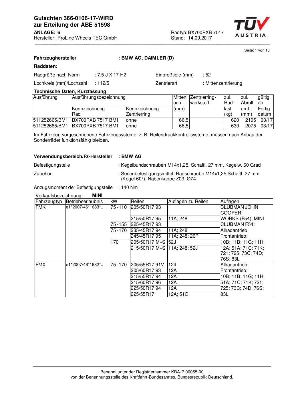 Felgengutachten / ABE für Alufelgen Proline BX700PXB.7517 (7.5Jx17 ET 0, Mittenloch 0 mm) mit KBA 51598 (Zertifikatsnummer KBA 51598). Hier kostenlos als PDF herunterladen. Der Download-Link ist 24 Stunden gültig und kann bis zu zwei Mal verwendet werden.