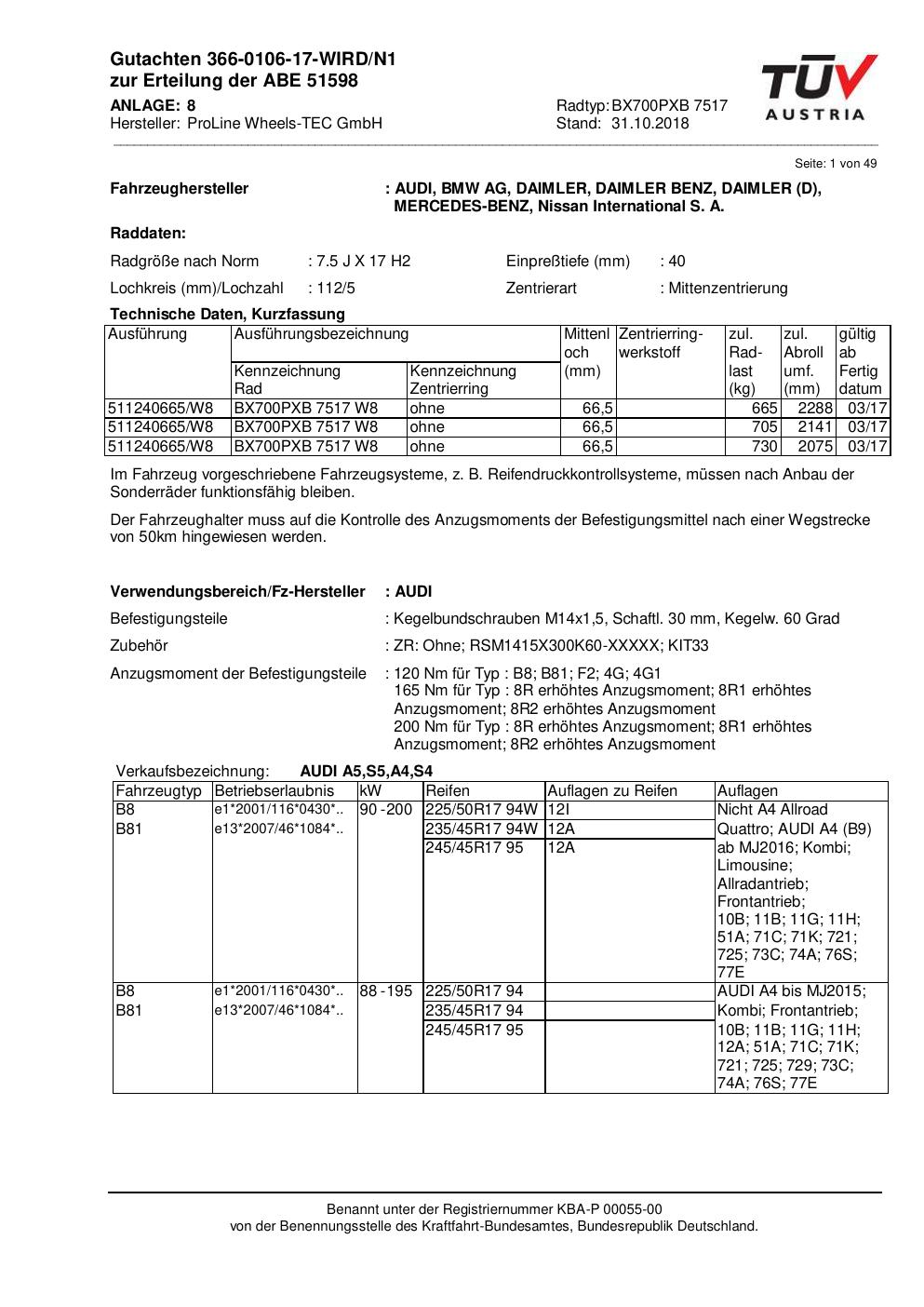 Felgengutachten / ABE für Alufelgen Proline BX700PXB.7517 (7.5Jx17 ET 0, Mittenloch 0 mm) mit KBA 51598 (Zertifikatsnummer KBA 51598). Hier kostenlos als PDF herunterladen. Der Download-Link ist 24 Stunden gültig und kann bis zu zwei Mal verwendet werden.