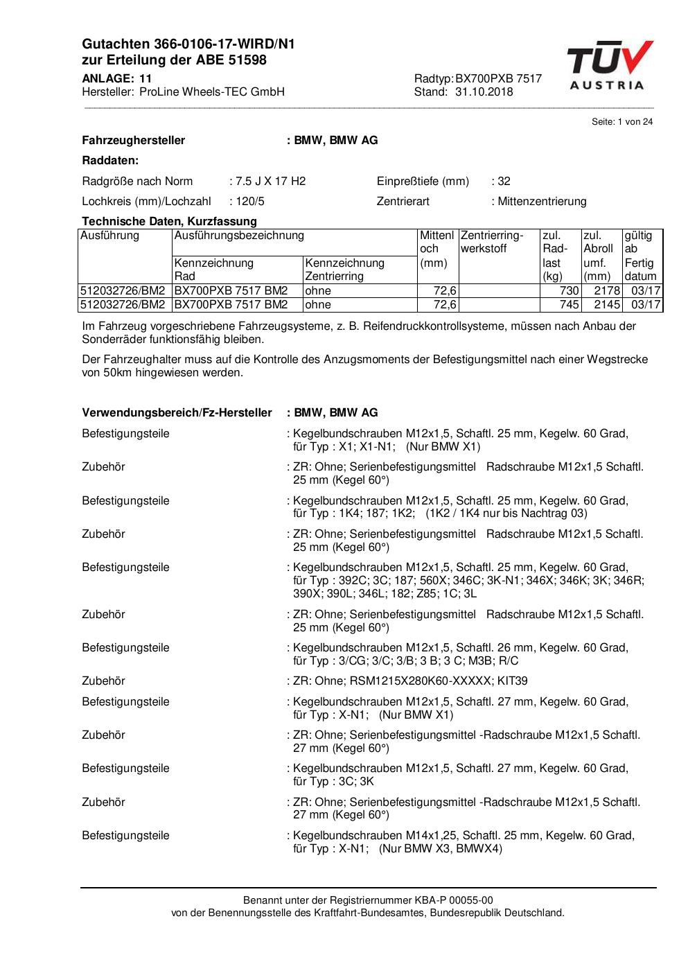 Dieses Gutachten (ABE) bezieht sich auf die Alufelge Proline BX700PXB.7517 in der Ausführung 7.5Jx17 ET 0, Mittenloch 0 mm (KBA 51598). Im PDF findest du typischerweise zulässige Reifengrößen, Auflagen/Anbauhinweise und – je nach Dokument – Hinweise zur Eintragung.