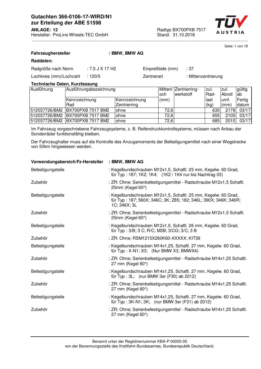 Dieses Gutachten (ABE) bezieht sich auf die Alufelge Proline BX700PXB.7517 in der Ausführung 7.5Jx17 ET 0, Mittenloch 0 mm (KBA 51598). Im PDF findest du typischerweise zulässige Reifengrößen, Auflagen/Anbauhinweise und – je nach Dokument – Hinweise zur Eintragung.