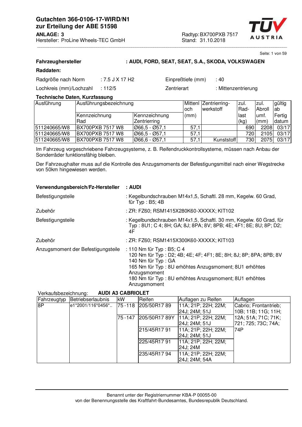 Felgengutachten / ABE für Alufelgen Proline BX700PXB.7517 (7.5Jx17 ET 0, Mittenloch 0 mm) mit KBA 51598 (Zertifikatsnummer KBA 51598). Hier kostenlos als PDF herunterladen. Der Download-Link ist 24 Stunden gültig und kann bis zu zwei Mal verwendet werden.