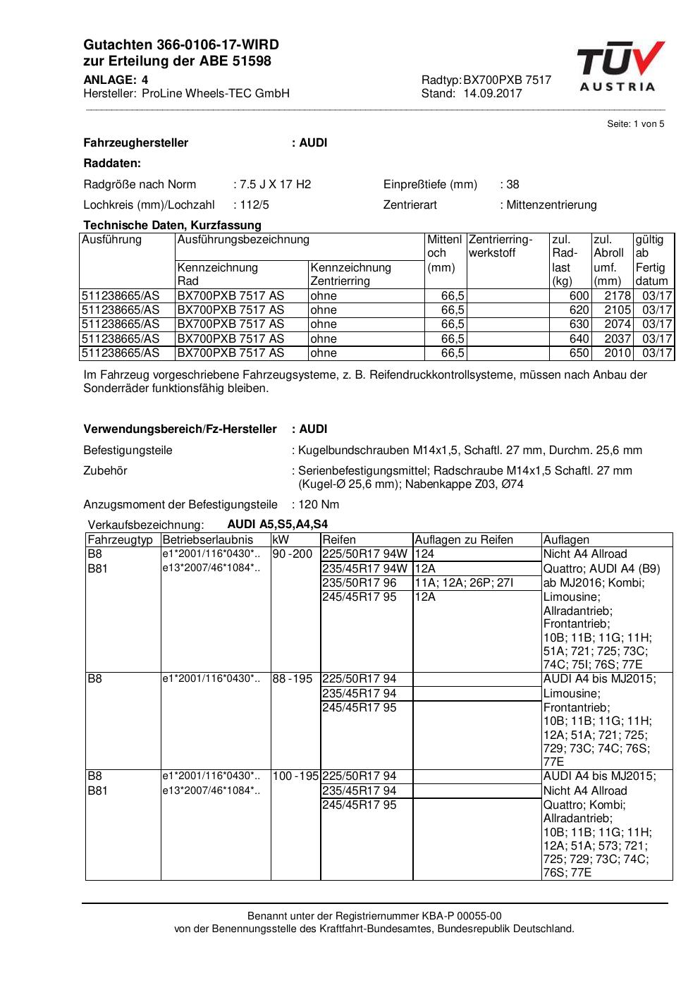 Dieses Gutachten (ABE) bezieht sich auf die Alufelge Proline BX700PXB.7517 in der Ausführung 7.5Jx17 ET 0, Mittenloch 0 mm (KBA 51598). Im PDF findest du typischerweise zulässige Reifengrößen, Auflagen/Anbauhinweise und – je nach Dokument – Hinweise zur Eintragung.