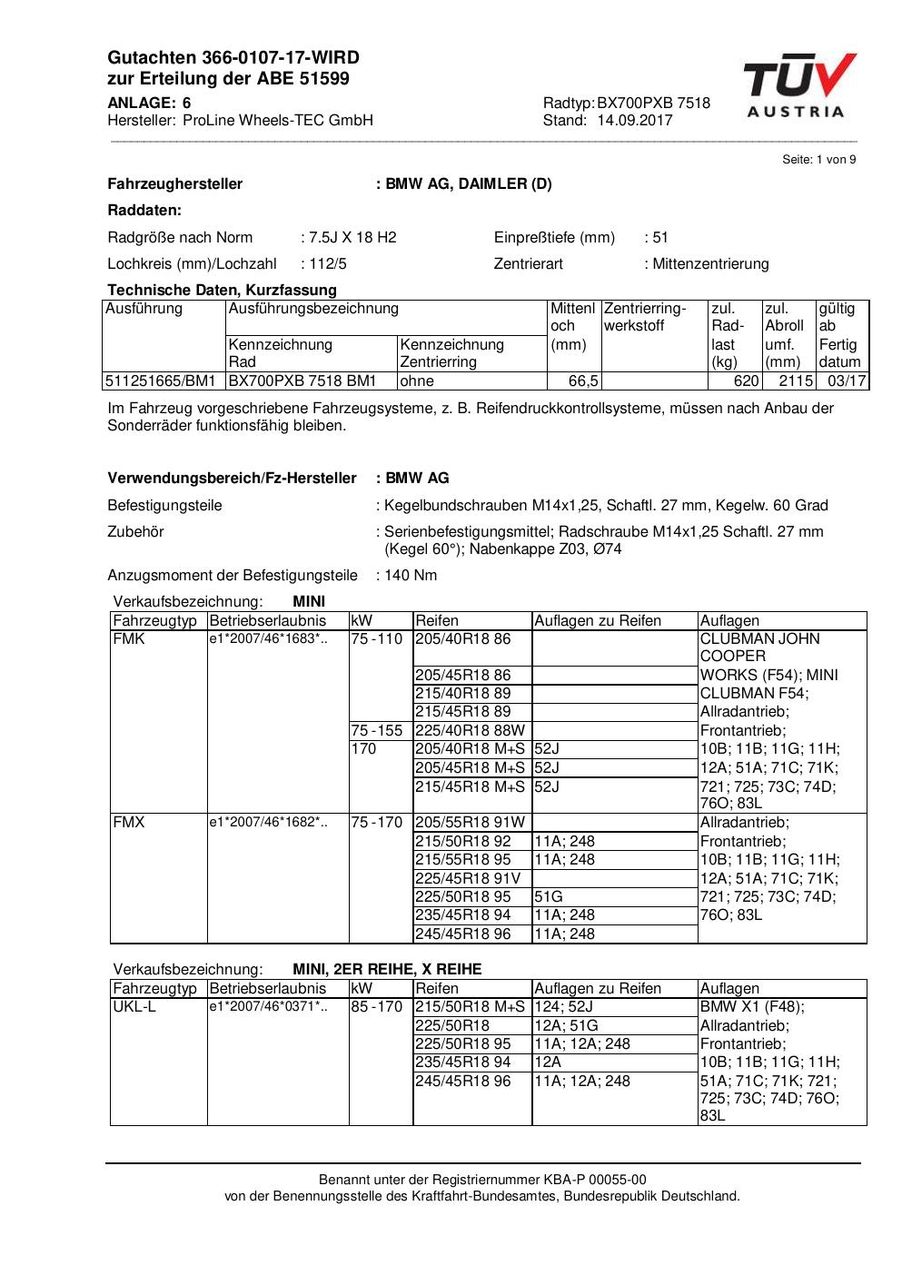 Felgengutachten / ABE für Alufelgen Proline BX700PXB.7518 (7.5Jx18 ET 0, Mittenloch 0 mm) mit KBA 51599 (Zertifikatsnummer KBA 51599). Hier kostenlos als PDF herunterladen. Der Download-Link ist 24 Stunden gültig und kann bis zu zwei Mal verwendet werden.