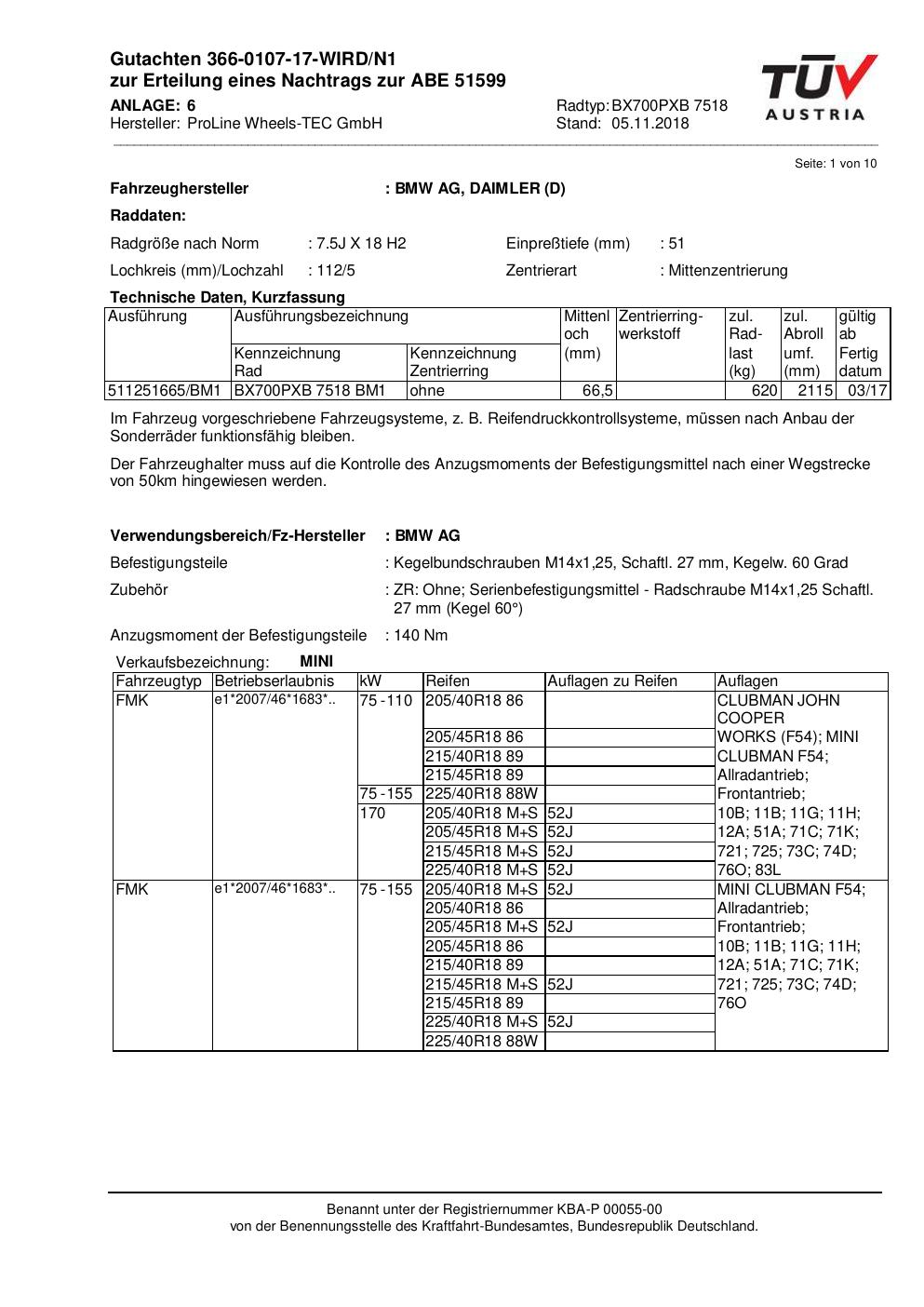 Felgengutachten / ABE für Alufelgen Proline BX700PXB.7518 (7.5Jx18 ET 0, Mittenloch 0 mm) mit KBA 51599 (Zertifikatsnummer KBA 51599). Hier kostenlos als PDF herunterladen. Der Download-Link ist 24 Stunden gültig und kann bis zu zwei Mal verwendet werden.