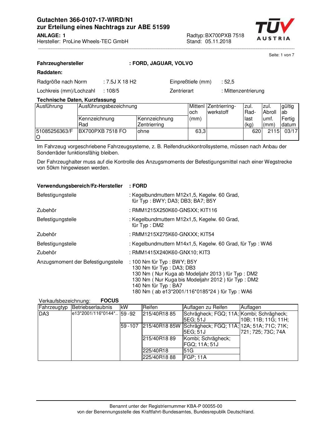 Dieses Gutachten (ABE) bezieht sich auf die Alufelge Proline BX700PXB.7518 in der Ausführung 7.5Jx18 ET 0, Mittenloch 0 mm (KBA 51599). Im PDF findest du typischerweise zulässige Reifengrößen, Auflagen/Anbauhinweise und – je nach Dokument – Hinweise zur Eintragung.
