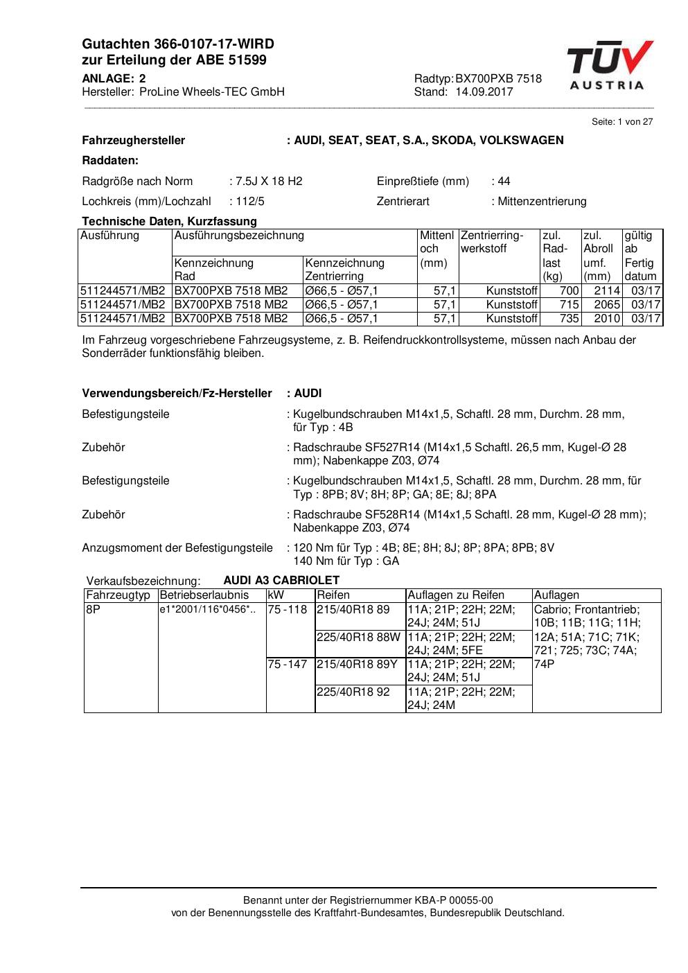 Felgengutachten / ABE für Alufelgen Proline BX700PXB.7518 (7.5Jx18 ET 0, Mittenloch 0 mm) mit KBA 51599 (Zertifikatsnummer KBA 51599). Hier kostenlos als PDF herunterladen. Der Download-Link ist 24 Stunden gültig und kann bis zu zwei Mal verwendet werden.