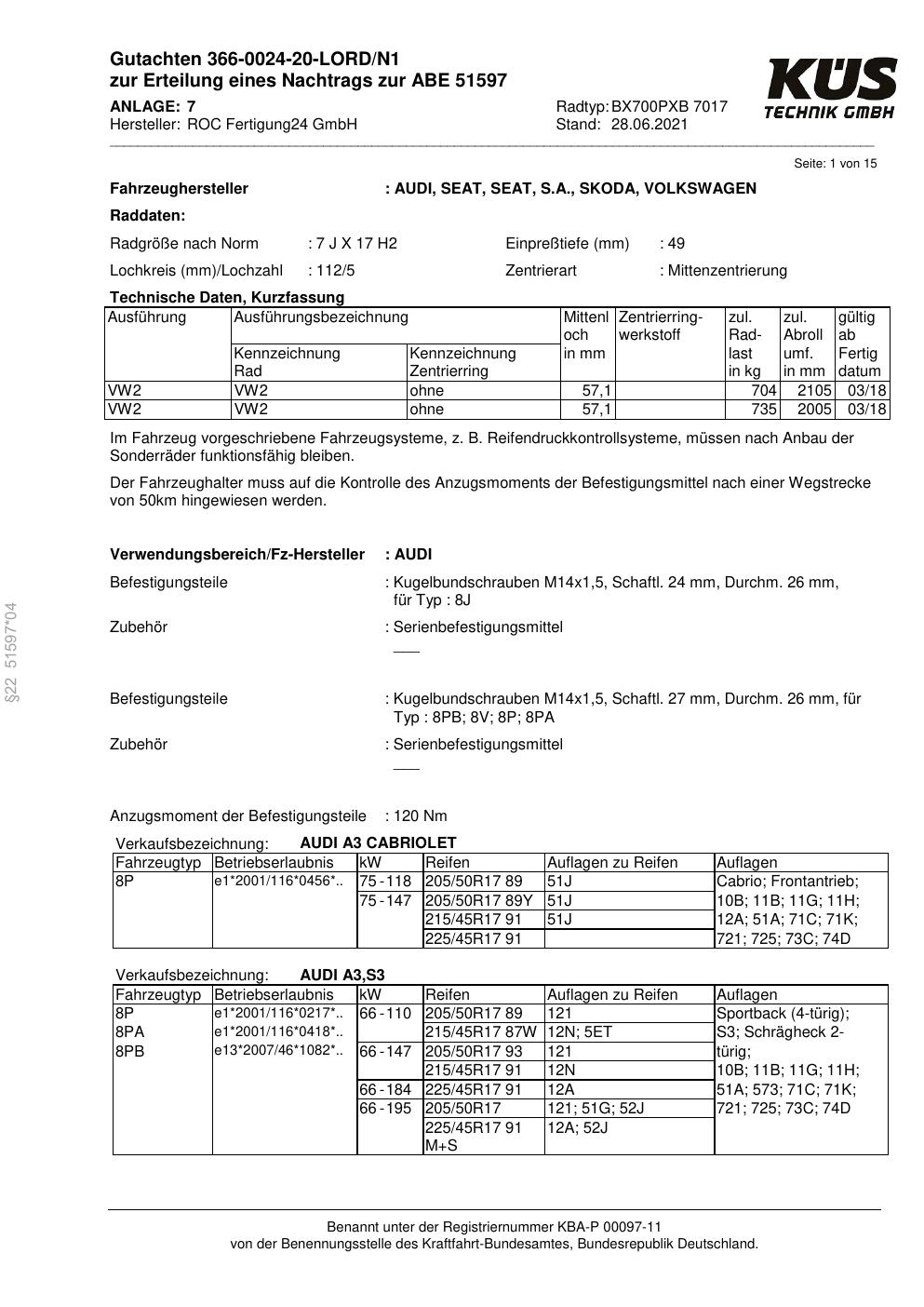 Felgengutachten / ABE für Alufelgen Proline BX700PXB (7Jx17 ET 0, Mittenloch 0 mm) mit KBA 51597 (Zertifikatsnummer KBA 51597). Hier kostenlos als PDF herunterladen. Der Download-Link ist 24 Stunden gültig und kann bis zu zwei Mal verwendet werden.