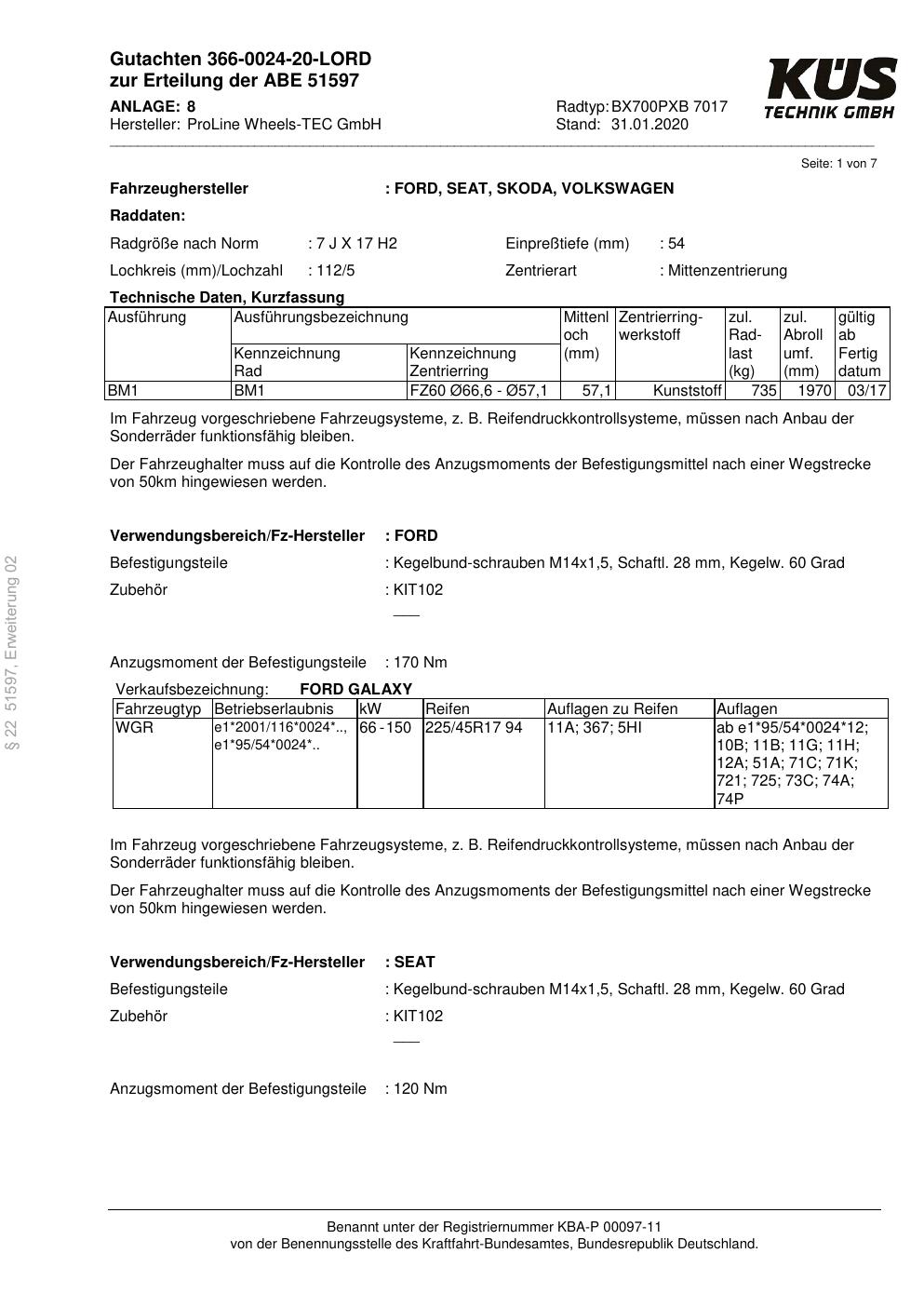 Dieses Gutachten (ABE) bezieht sich auf die Alufelge Proline BX700PXB in der Ausführung 7Jx17 ET 0, Mittenloch 0 mm (KBA 51597). Im PDF findest du typischerweise zulässige Reifengrößen, Auflagen/Anbauhinweise und – je nach Dokument – Hinweise zur Eintragung.