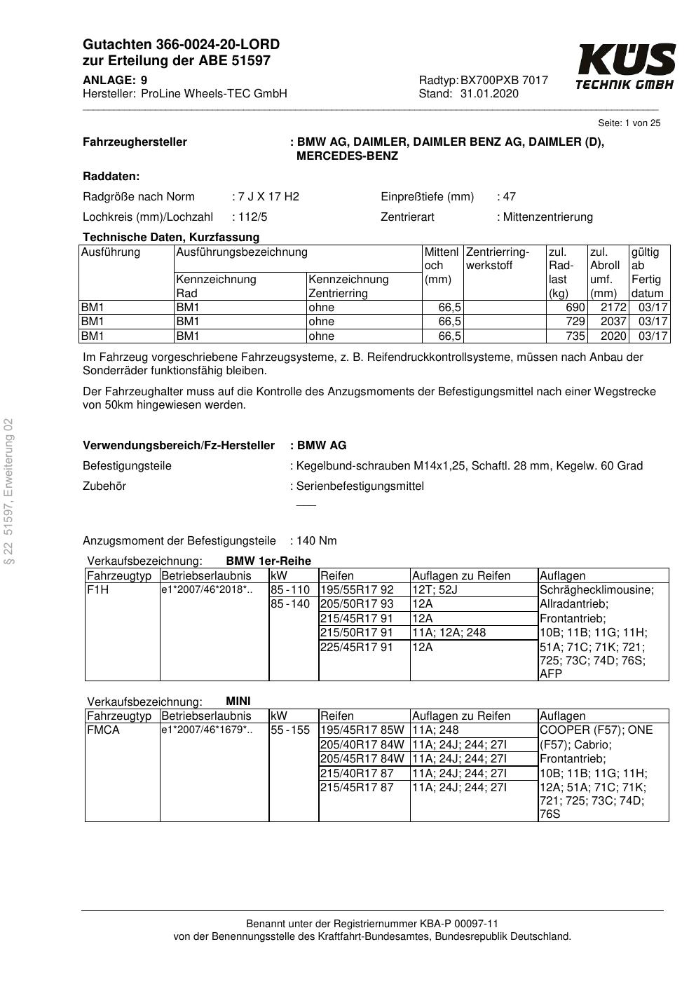 Dieses ABE gehört zur Felge Proline BX700PXB in 7Jx17 ET0 mit KBA 51597. Die Seite ist dafür gedacht, dass du schnell prüfen kannst, ob KBA, Design und Größe zu deiner Felge passen und danach direkt das richtige PDF lädst.