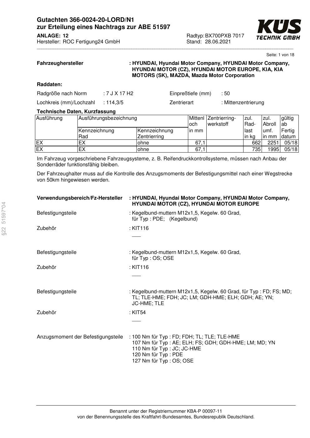 Dieses Gutachten (ABE) bezieht sich auf die Alufelge Proline BX700PXB in der Ausführung 7Jx17 ET 0, Mittenloch 0 mm (KBA 51597). Im PDF findest du typischerweise zulässige Reifengrößen, Auflagen/Anbauhinweise und – je nach Dokument – Hinweise zur Eintragung.