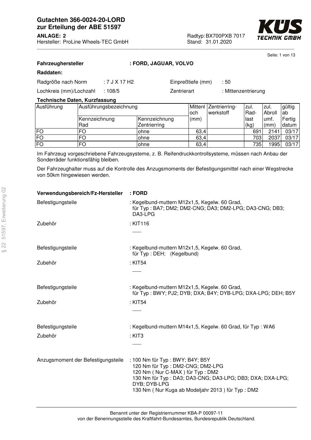 Dieses Gutachten (ABE) bezieht sich auf die Alufelge Proline BX700PXB in der Ausführung 7Jx17 ET 0, Mittenloch 0 mm (KBA 51597). Im PDF findest du typischerweise zulässige Reifengrößen, Auflagen/Anbauhinweise und – je nach Dokument – Hinweise zur Eintragung.