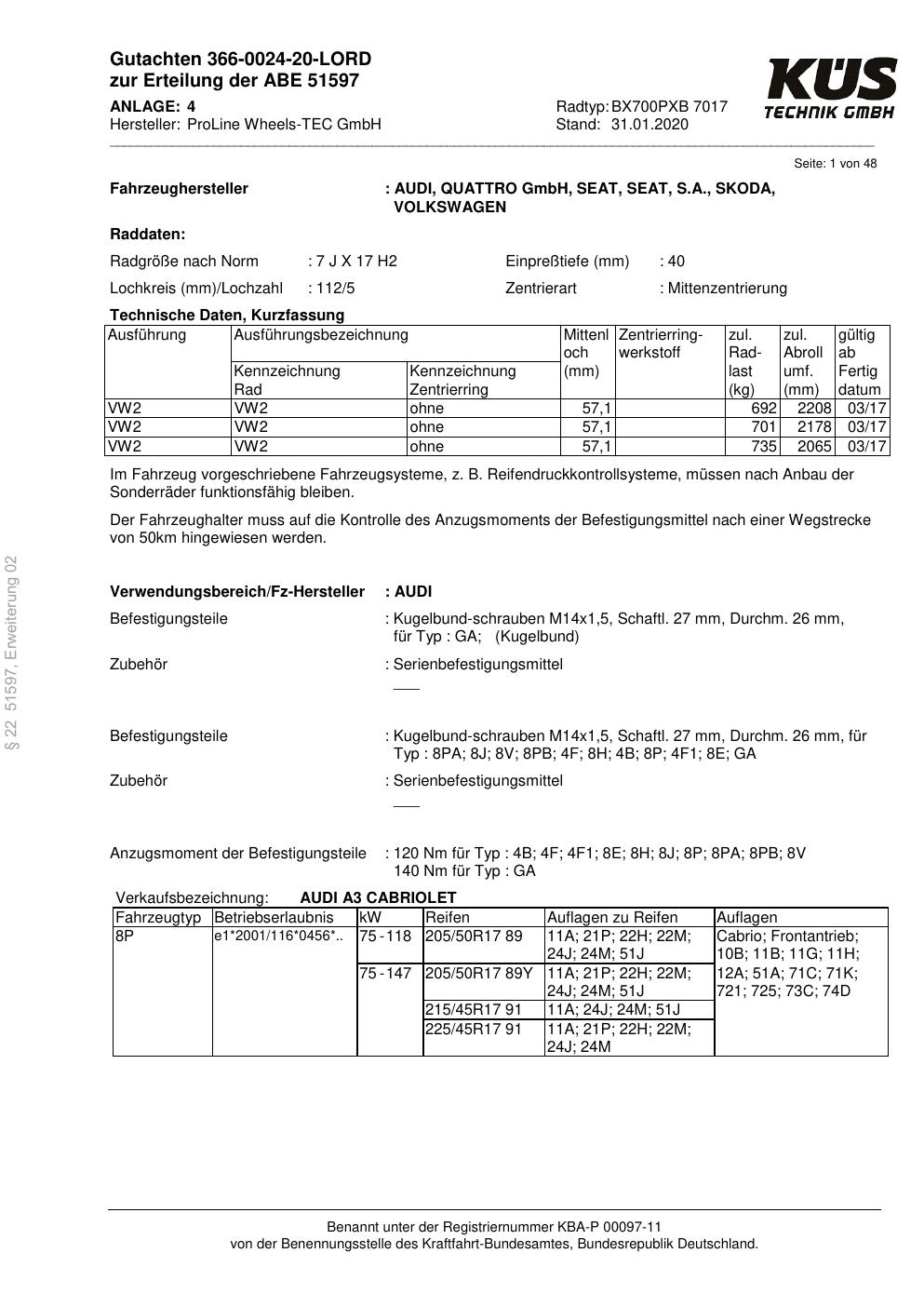 Dieses Gutachten (ABE) bezieht sich auf die Alufelge Proline BX700PXB in der Ausführung 7Jx17 ET 0, Mittenloch 0 mm (KBA 51597). Im PDF findest du typischerweise zulässige Reifengrößen, Auflagen/Anbauhinweise und – je nach Dokument – Hinweise zur Eintragung.