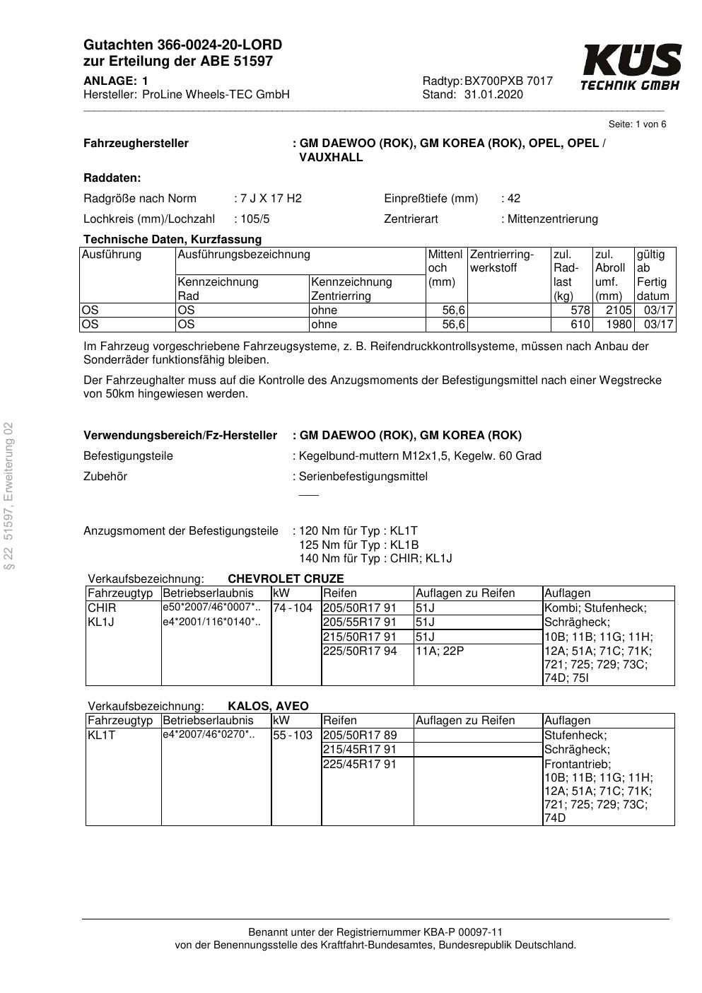 Dieses Gutachten (ABE) bezieht sich auf die Alufelge Proline BX700PXB in der Ausführung 7Jx17 ET 0, Mittenloch 0 mm (KBA 51597). Im PDF findest du typischerweise zulässige Reifengrößen, Auflagen/Anbauhinweise und – je nach Dokument – Hinweise zur Eintragung.