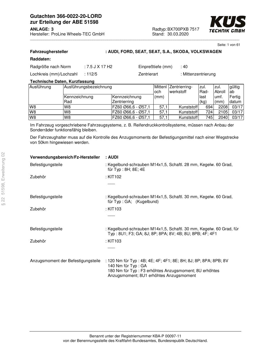 Felgengutachten / ABE für Alufelgen Proline BX700PXB (7.5Jx17 ET 0, Mittenloch 0 mm) mit KBA 51598 (Zertifikatsnummer KBA 51598). Hier kostenlos als PDF herunterladen. Der Download-Link ist 24 Stunden gültig und kann bis zu zwei Mal verwendet werden.