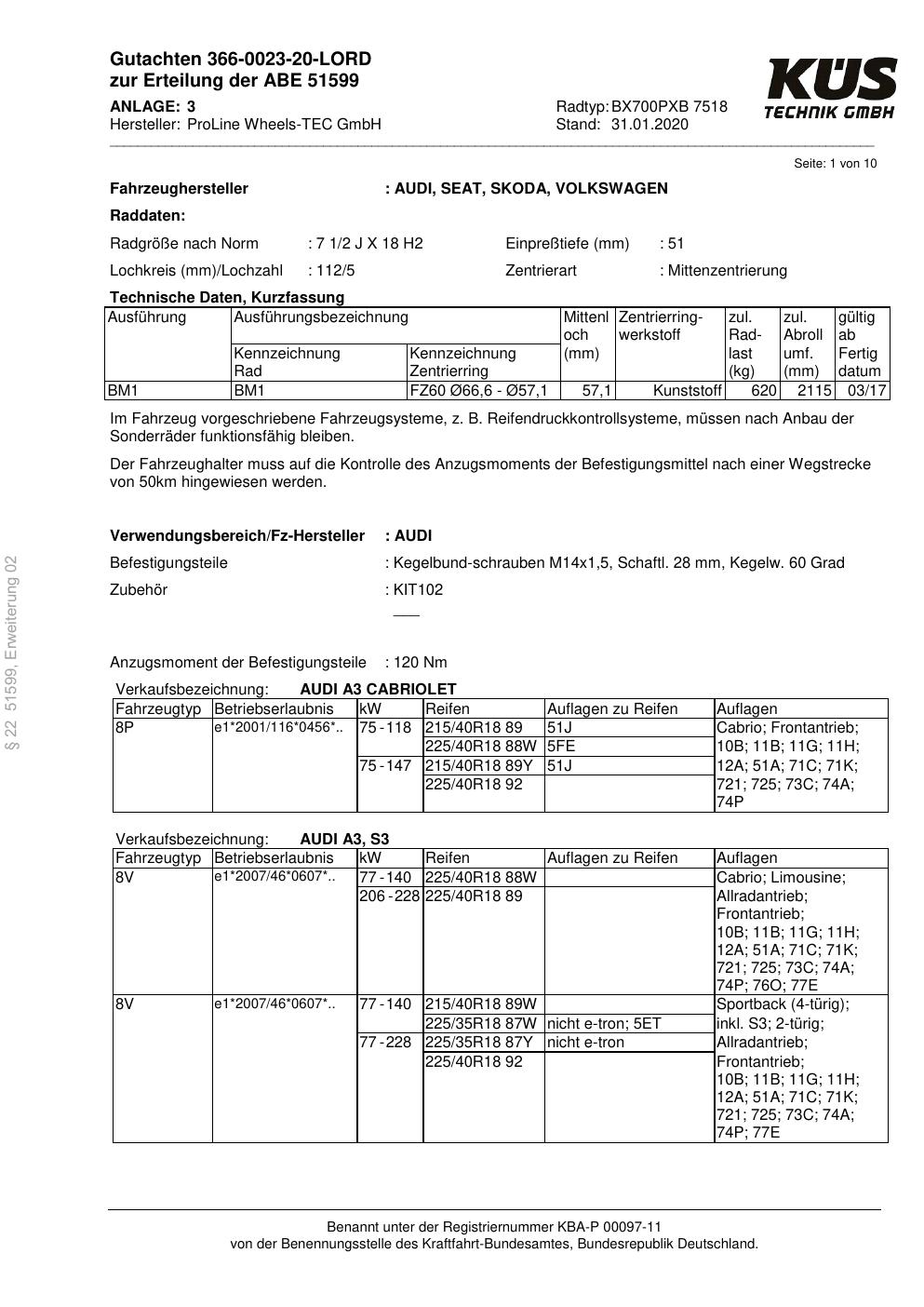 Dieses Gutachten (ABE) bezieht sich auf die Alufelge Proline BX700PXB in der Ausführung 7.5Jx18 ET 0, Mittenloch 0 mm (KBA 51599). Im PDF findest du typischerweise zulässige Reifengrößen, Auflagen/Anbauhinweise und – je nach Dokument – Hinweise zur Eintragung.