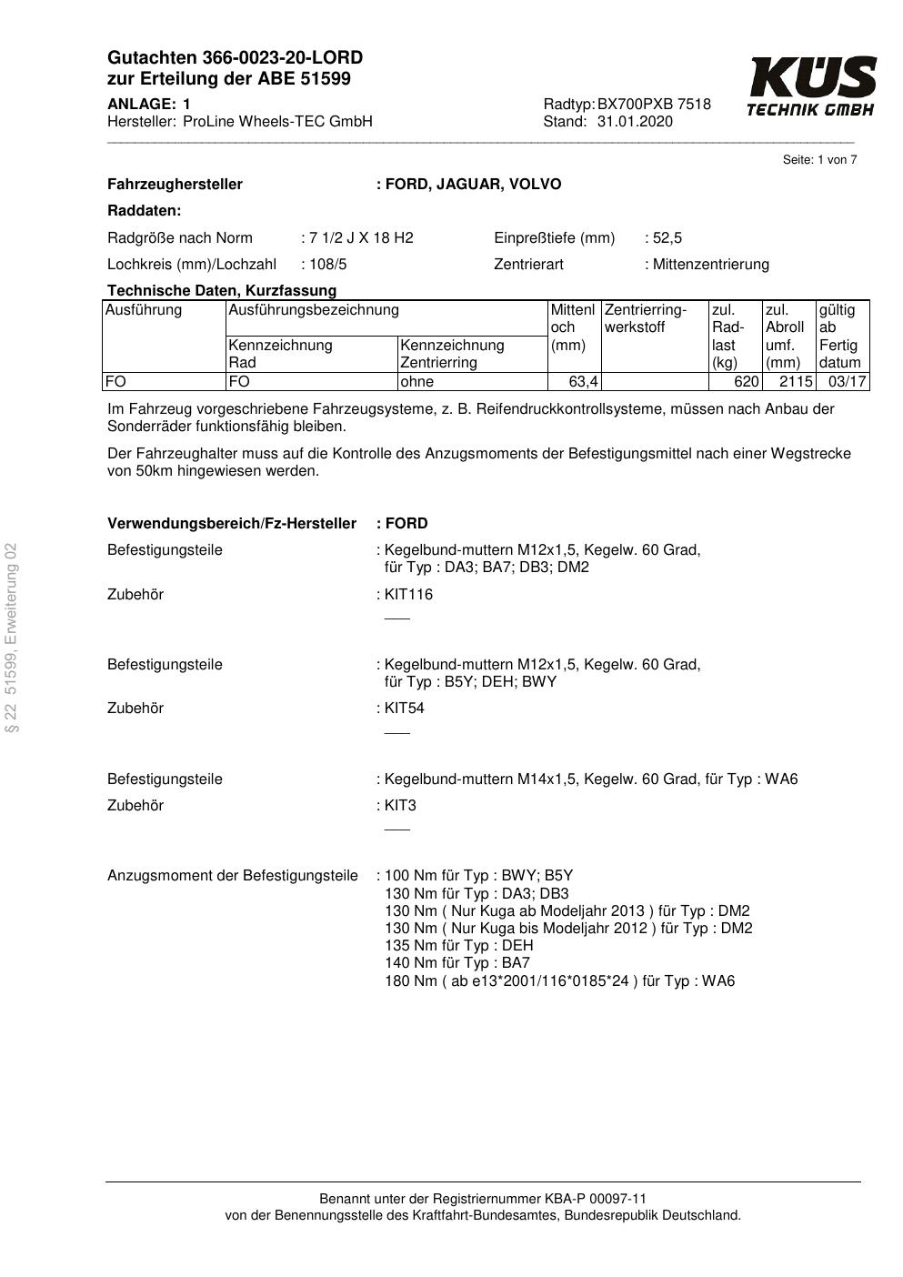 Dieses Gutachten (ABE) bezieht sich auf die Alufelge Proline BX700PXB in der Ausführung 7.5Jx18 ET 0, Mittenloch 0 mm (KBA 51599). Im PDF findest du typischerweise zulässige Reifengrößen, Auflagen/Anbauhinweise und – je nach Dokument – Hinweise zur Eintragung.