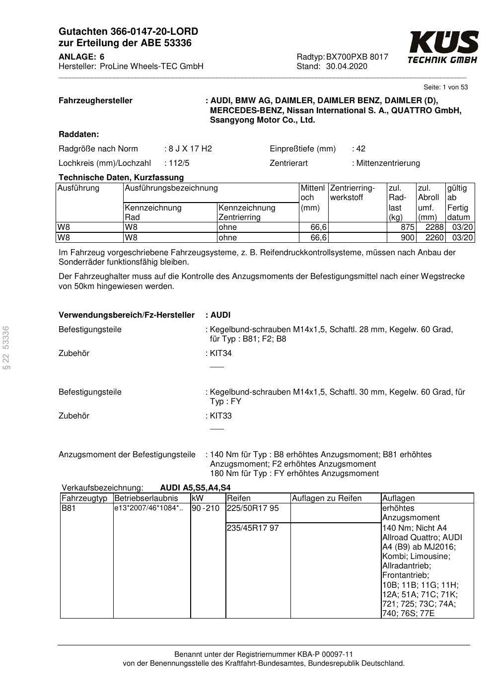 Dieses Gutachten (ABE) bezieht sich auf die Alufelge Proline BX700PXB in der Ausführung 8Jx17 ET 0, Mittenloch 0 mm (KBA 53336). Im PDF findest du typischerweise zulässige Reifengrößen, Auflagen/Anbauhinweise und – je nach Dokument – Hinweise zur Eintragung.