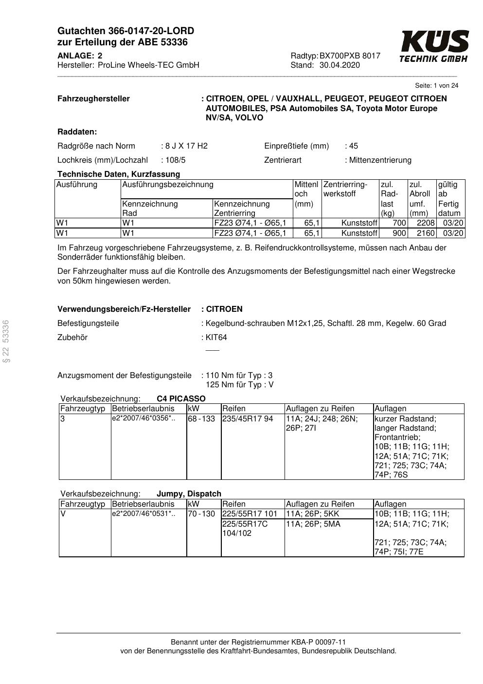 Dieses ABE gehört zur Felge Proline BX700PXB in 8Jx17 ET0 mit KBA 53336. Die Seite ist dafür gedacht, dass du schnell prüfen kannst, ob KBA, Design und Größe zu deiner Felge passen und danach direkt das richtige PDF lädst.