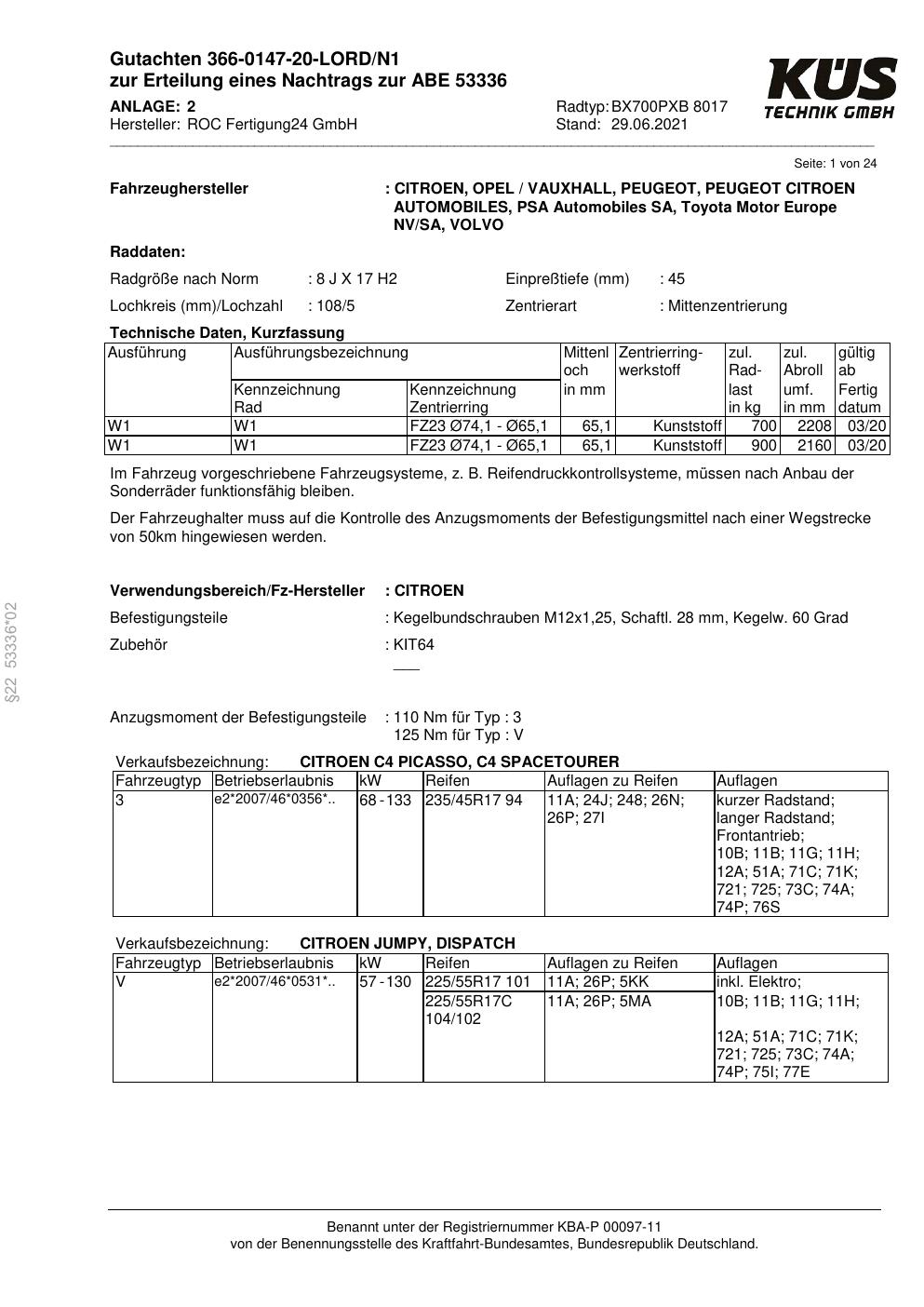 Dieses Gutachten (ABE) bezieht sich auf die Alufelge Proline BX700PXB in der Ausführung 8Jx17 ET 0, Mittenloch 0 mm (KBA 53336). Im PDF findest du typischerweise zulässige Reifengrößen, Auflagen/Anbauhinweise und – je nach Dokument – Hinweise zur Eintragung.