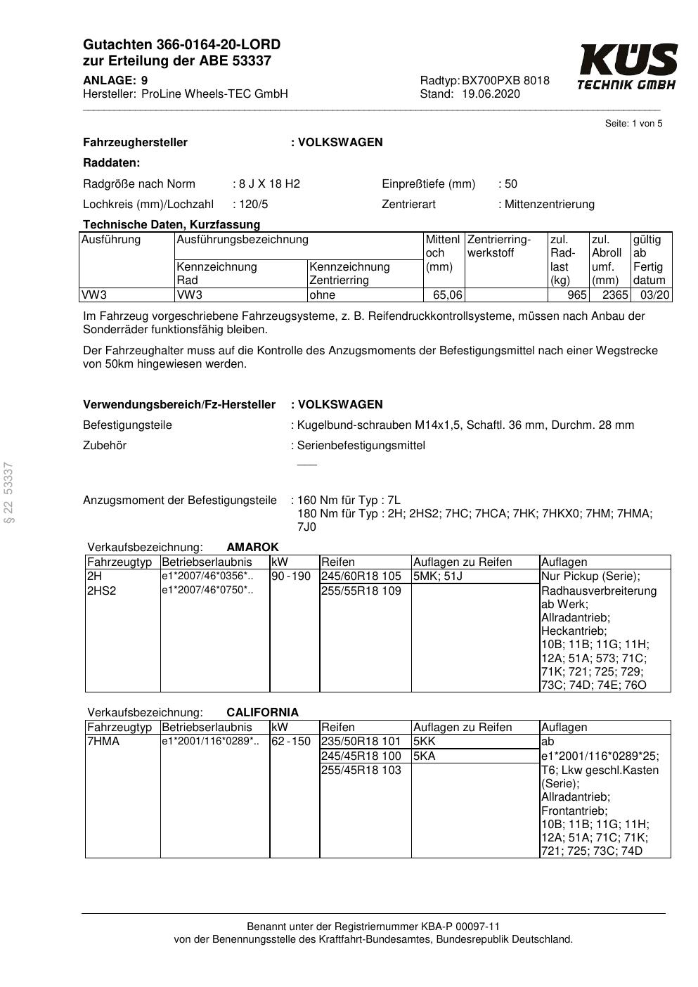 Felgengutachten / ABE für Alufelgen Proline BX700PXB (8Jx18 ET 0, Mittenloch 0 mm) mit KBA 53337 (Zertifikatsnummer KBA 53337). Hier kostenlos als PDF herunterladen. Der Download-Link ist 24 Stunden gültig und kann bis zu zwei Mal verwendet werden.