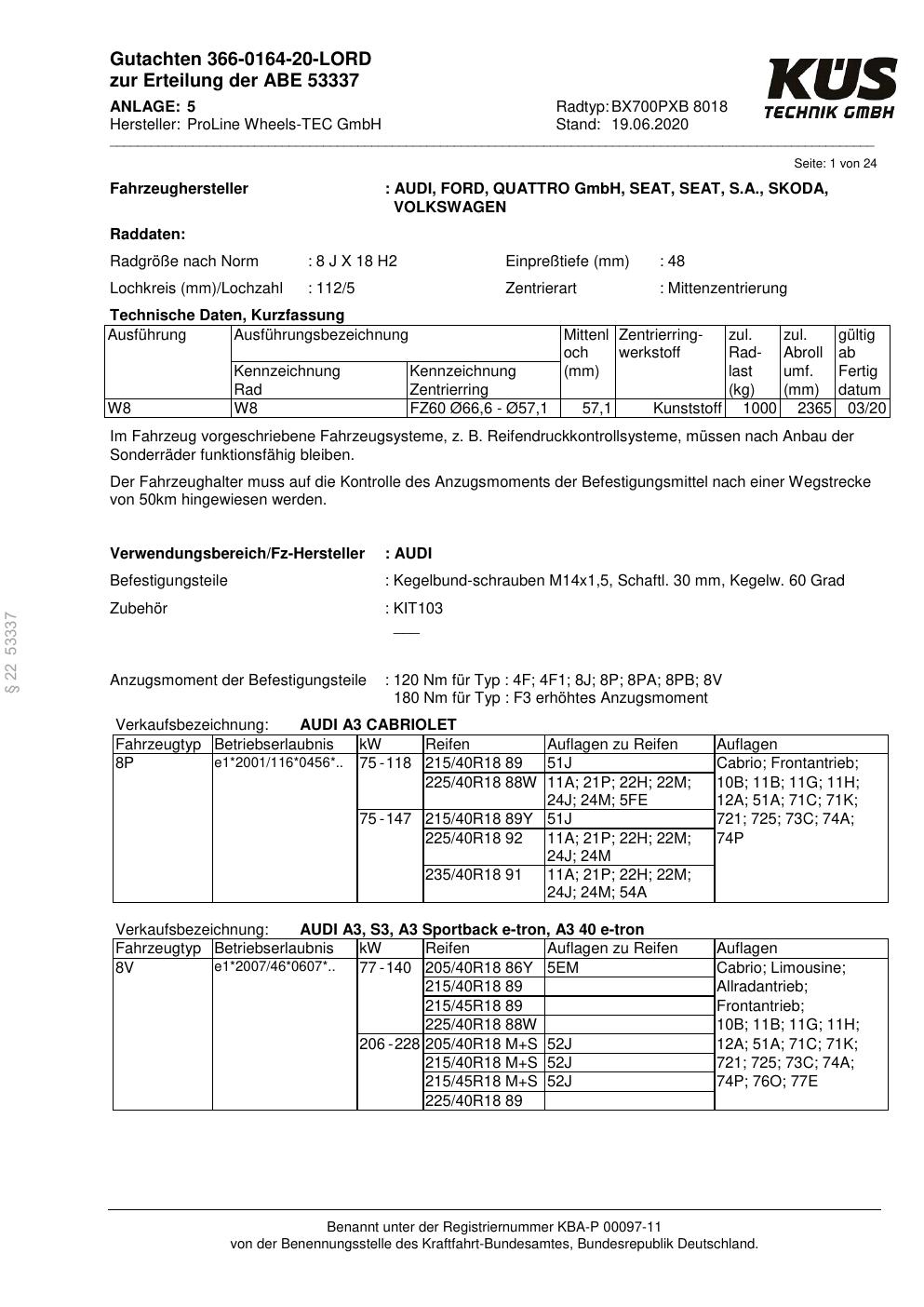 Dieses ABE gehört zur Felge Proline BX700PXB in 8Jx18 ET0 mit KBA 53337. Die Seite ist dafür gedacht, dass du schnell prüfen kannst, ob KBA, Design und Größe zu deiner Felge passen und danach direkt das richtige PDF lädst.
