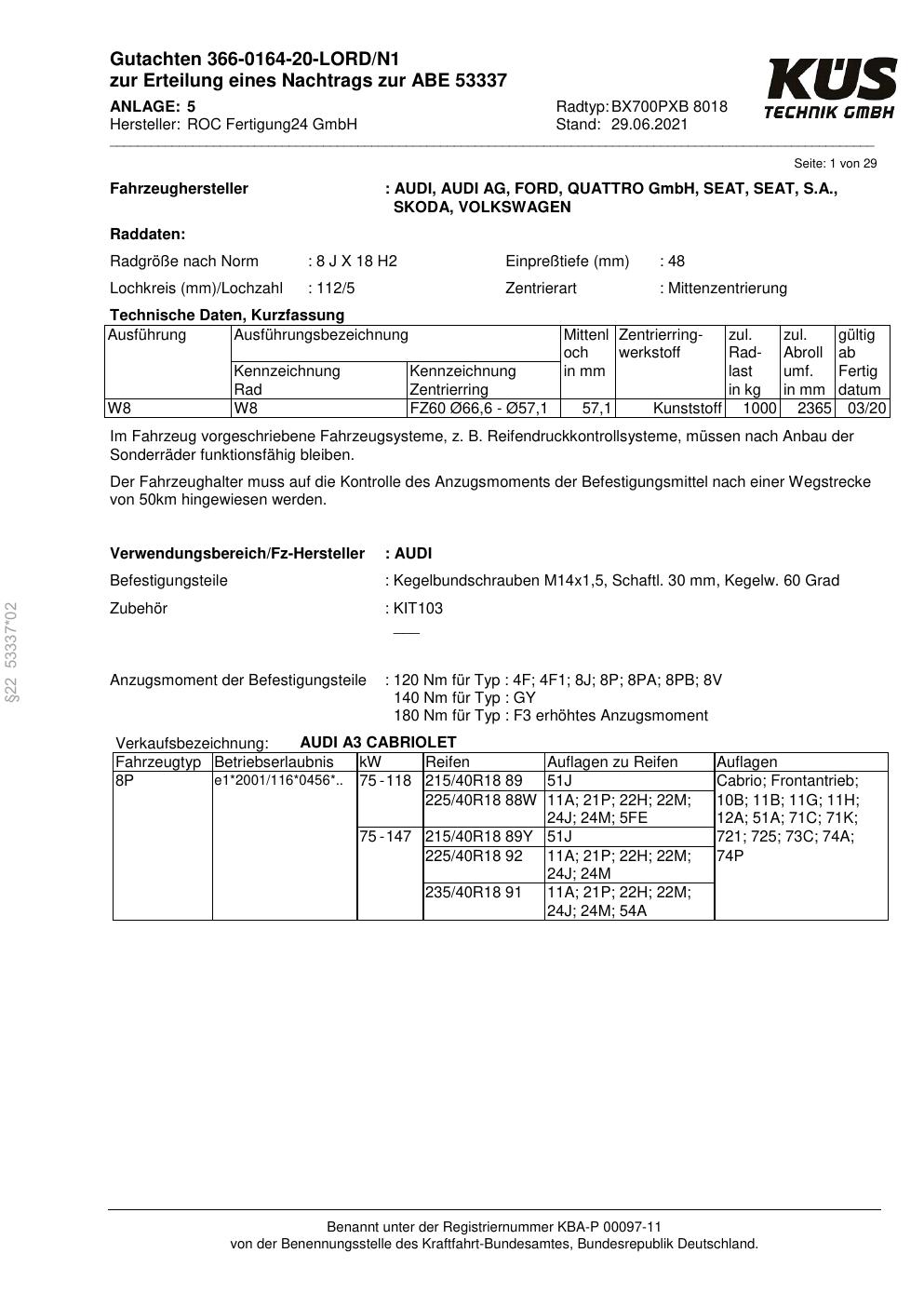 Felgengutachten / ABE für Alufelgen Proline BX700PXB (8Jx18 ET 0, Mittenloch 0 mm) mit KBA 53337 (Zertifikatsnummer KBA 53337). Hier kostenlos als PDF herunterladen. Der Download-Link ist 24 Stunden gültig und kann bis zu zwei Mal verwendet werden.