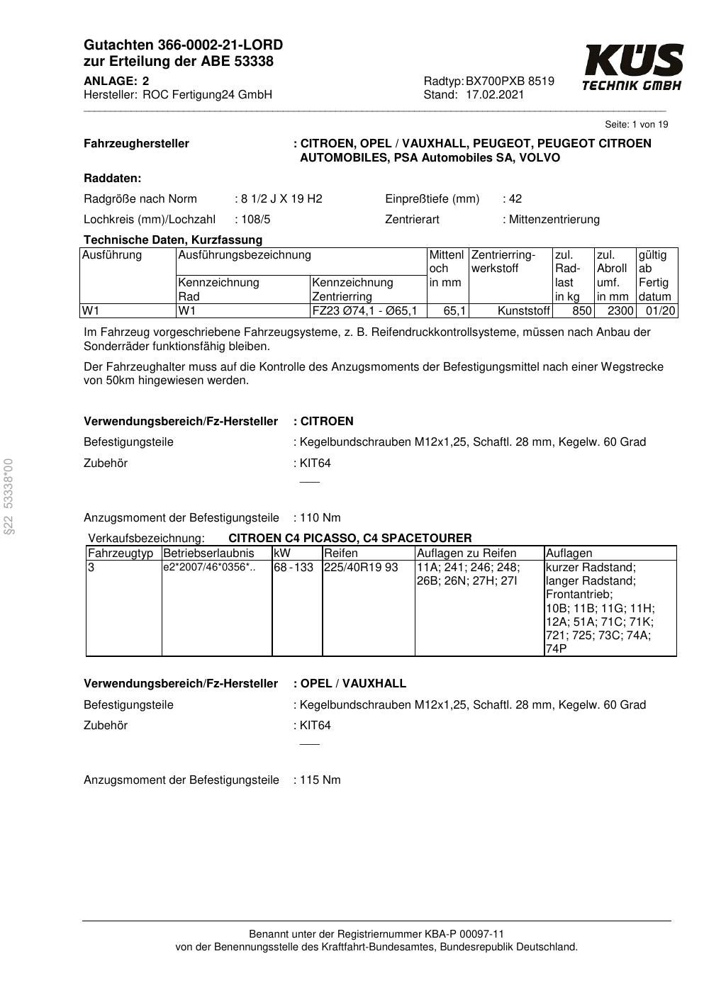 Dieses Gutachten (ABE) bezieht sich auf die Alufelge Proline BX700PXB in der Ausführung 8.5Jx19 ET 0, Mittenloch 0 mm (KBA 53338). Im PDF findest du typischerweise zulässige Reifengrößen, Auflagen/Anbauhinweise und – je nach Dokument – Hinweise zur Eintragung.