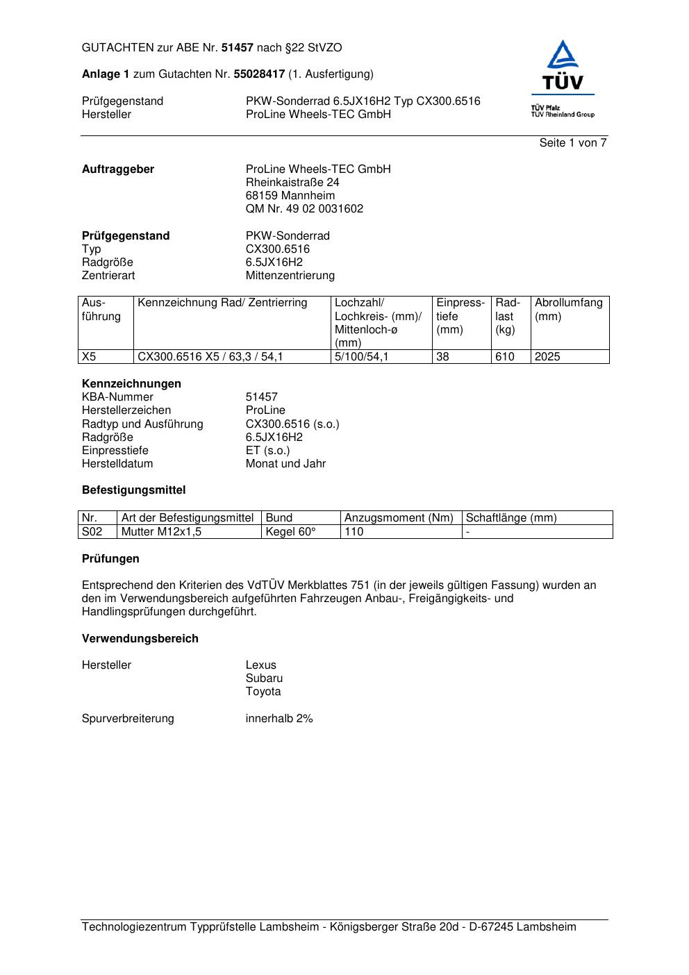 Dieses Gutachten (ABE) bezieht sich auf die Alufelge Proline CX300.6516 in der Ausführung 6.5Jx16 ET 0, Mittenloch 0 mm (KBA 51457). Im PDF findest du typischerweise zulässige Reifengrößen, Auflagen/Anbauhinweise und – je nach Dokument – Hinweise zur Eintragung.