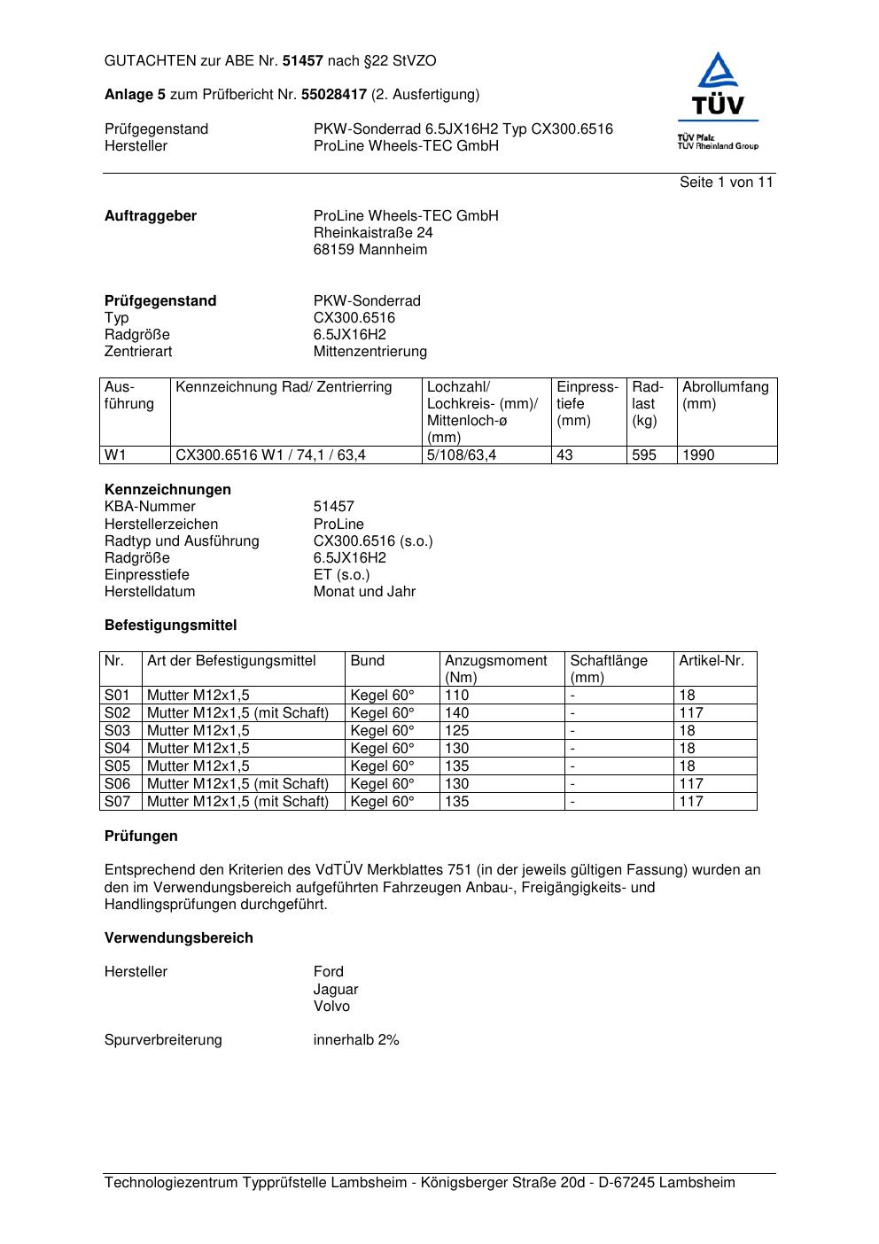 Dieses Gutachten (ABE) bezieht sich auf die Alufelge Proline CX300.6516 in der Ausführung 6.5Jx16 ET 0, Mittenloch 0 mm (KBA 51457). Im PDF findest du typischerweise zulässige Reifengrößen, Auflagen/Anbauhinweise und – je nach Dokument – Hinweise zur Eintragung.