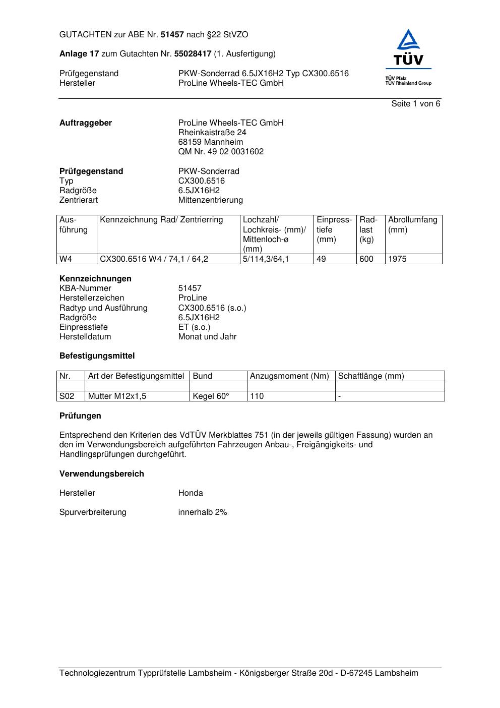Dieses Gutachten (ABE) bezieht sich auf die Alufelge Proline CX300.6516 in der Ausführung 6.5Jx16 ET 0, Mittenloch 0 mm (KBA 51457). Im PDF findest du typischerweise zulässige Reifengrößen, Auflagen/Anbauhinweise und – je nach Dokument – Hinweise zur Eintragung.