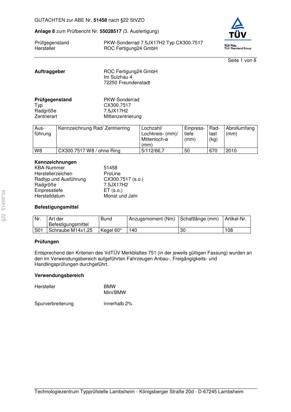 Dieses Gutachten (ABE) bezieht sich auf die Alufelge Proline CX300.7517 in der Ausführung 7.5Jx17 ET 0, Mittenloch 0 mm (KBA 51458). Im PDF findest du typischerweise zulässige Reifengrößen, Auflagen/Anbauhinweise und – je nach Dokument – Hinweise zur Eintragung.