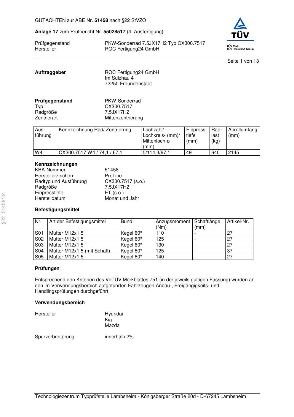 Dieses Gutachten (ABE) bezieht sich auf die Alufelge Proline CX300.7517 in der Ausführung 7.5Jx17 ET 0, Mittenloch 0 mm (KBA 51458). Im PDF findest du typischerweise zulässige Reifengrößen, Auflagen/Anbauhinweise und – je nach Dokument – Hinweise zur Eintragung.
