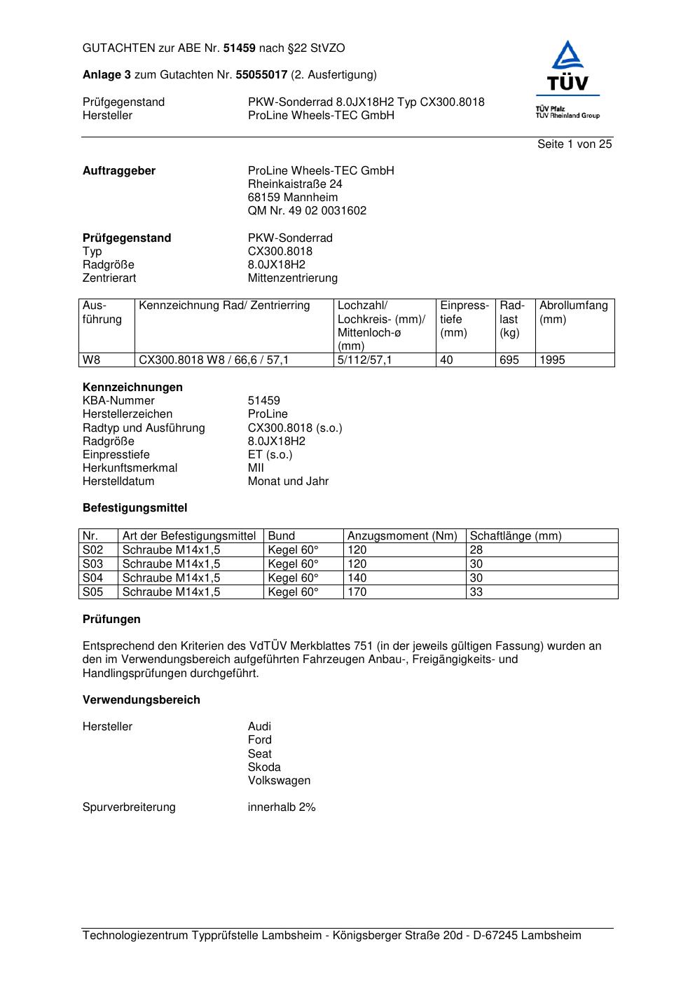 Dieses Gutachten (ABE) bezieht sich auf die Alufelge Proline CX300.8018 in der Ausführung 8Jx18 ET 0, Mittenloch 0 mm (KBA 51459). Im PDF findest du typischerweise zulässige Reifengrößen, Auflagen/Anbauhinweise und – je nach Dokument – Hinweise zur Eintragung.