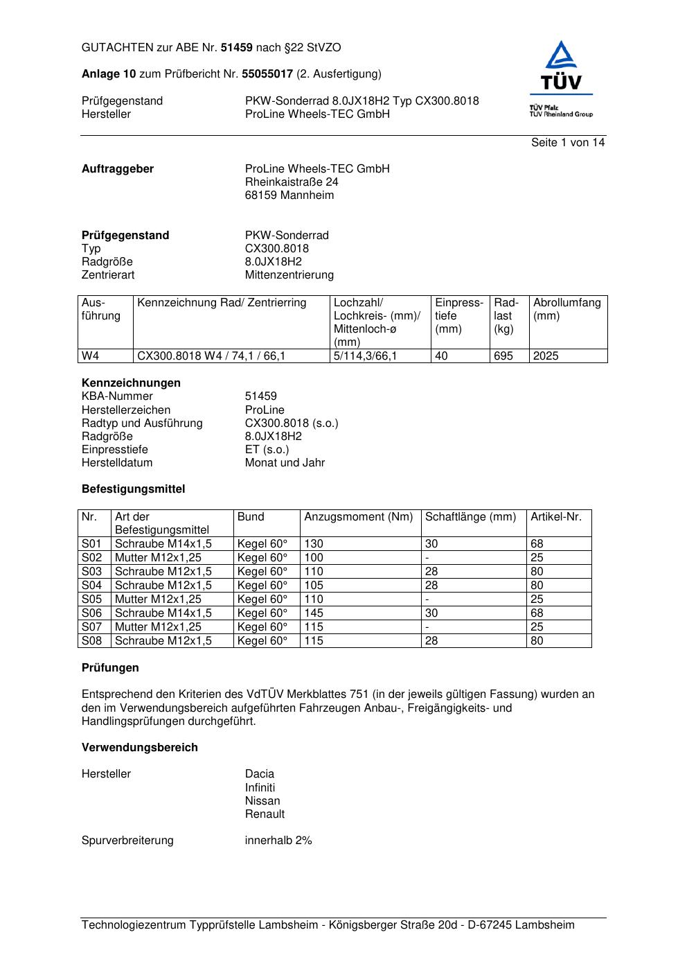 Dieses Gutachten (ABE) bezieht sich auf die Alufelge Proline CX300.8018 in der Ausführung 8Jx18 ET 0, Mittenloch 0 mm (KBA 51459). Im PDF findest du typischerweise zulässige Reifengrößen, Auflagen/Anbauhinweise und – je nach Dokument – Hinweise zur Eintragung.