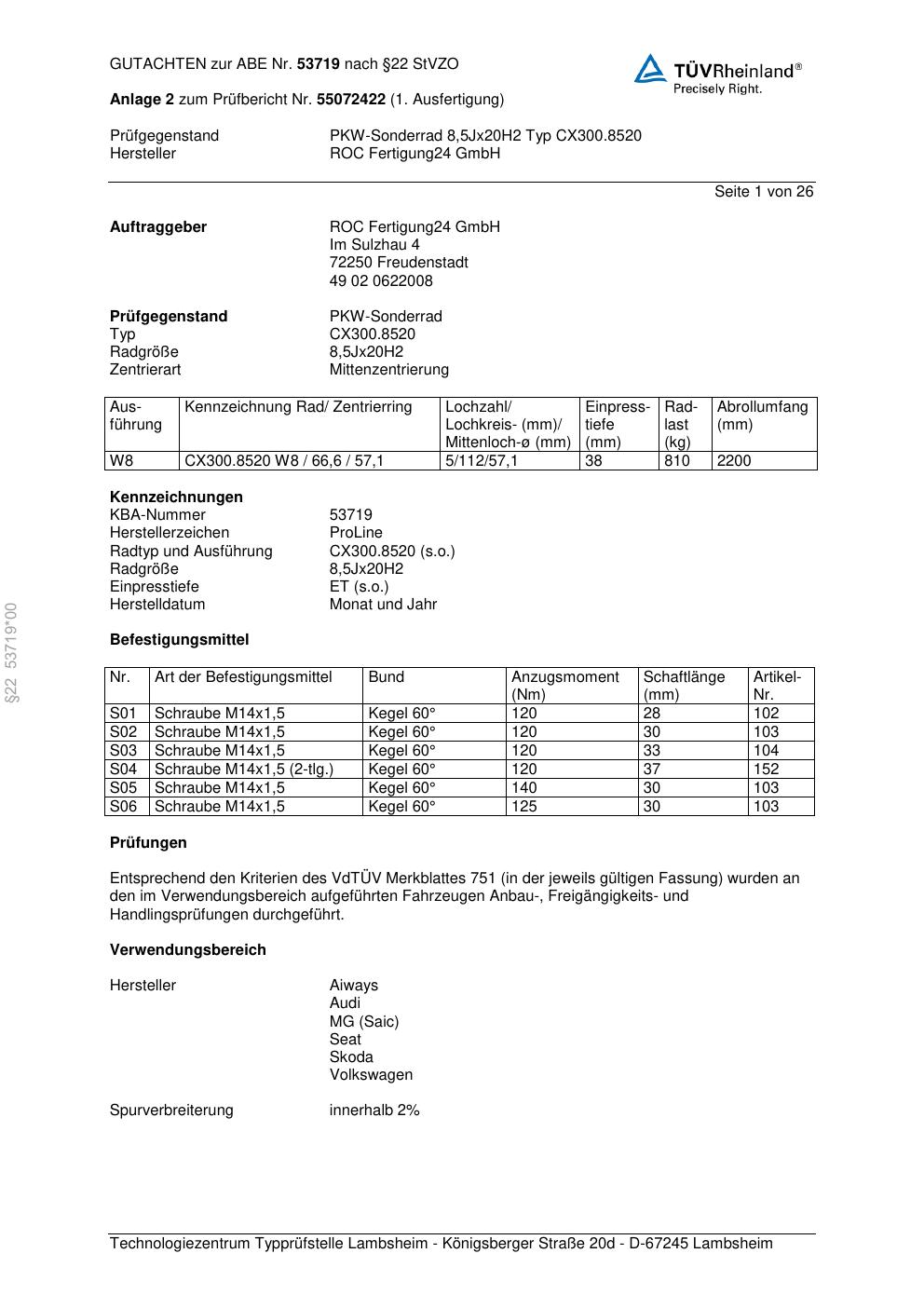 Felgengutachten / ABE für Alufelgen Proline CX300.85 (8.5Jx2 ET 0, Mittenloch 0 mm) mit KBA 53719 (Zertifikatsnummer KBA 53719). Hier kostenlos als PDF herunterladen. Der Download-Link ist 24 Stunden gültig und kann bis zu zwei Mal verwendet werden.