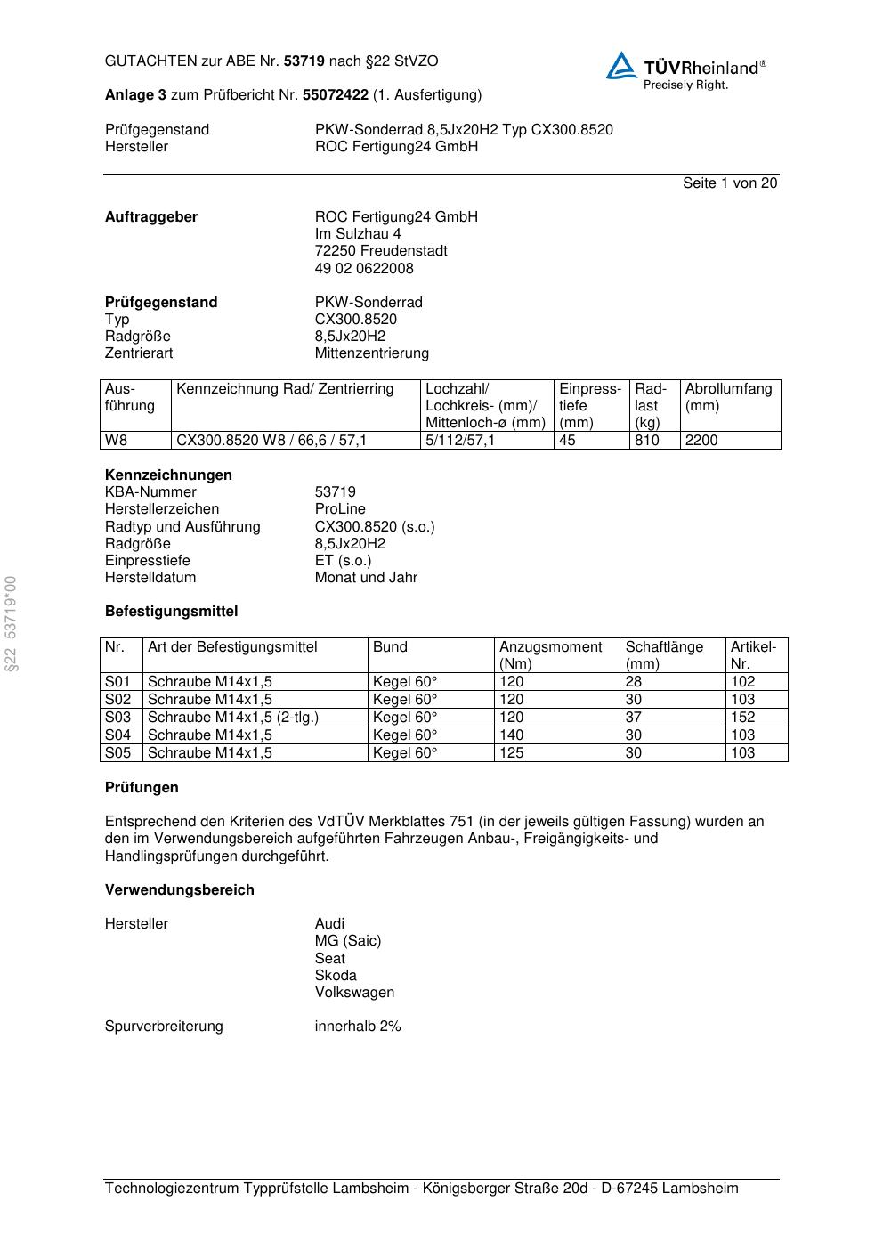 Felgengutachten / ABE für Alufelgen Proline CX300.85 (8.5Jx2 ET 0, Mittenloch 0 mm) mit KBA 53719 (Zertifikatsnummer KBA 53719). Hier kostenlos als PDF herunterladen. Der Download-Link ist 24 Stunden gültig und kann bis zu zwei Mal verwendet werden.