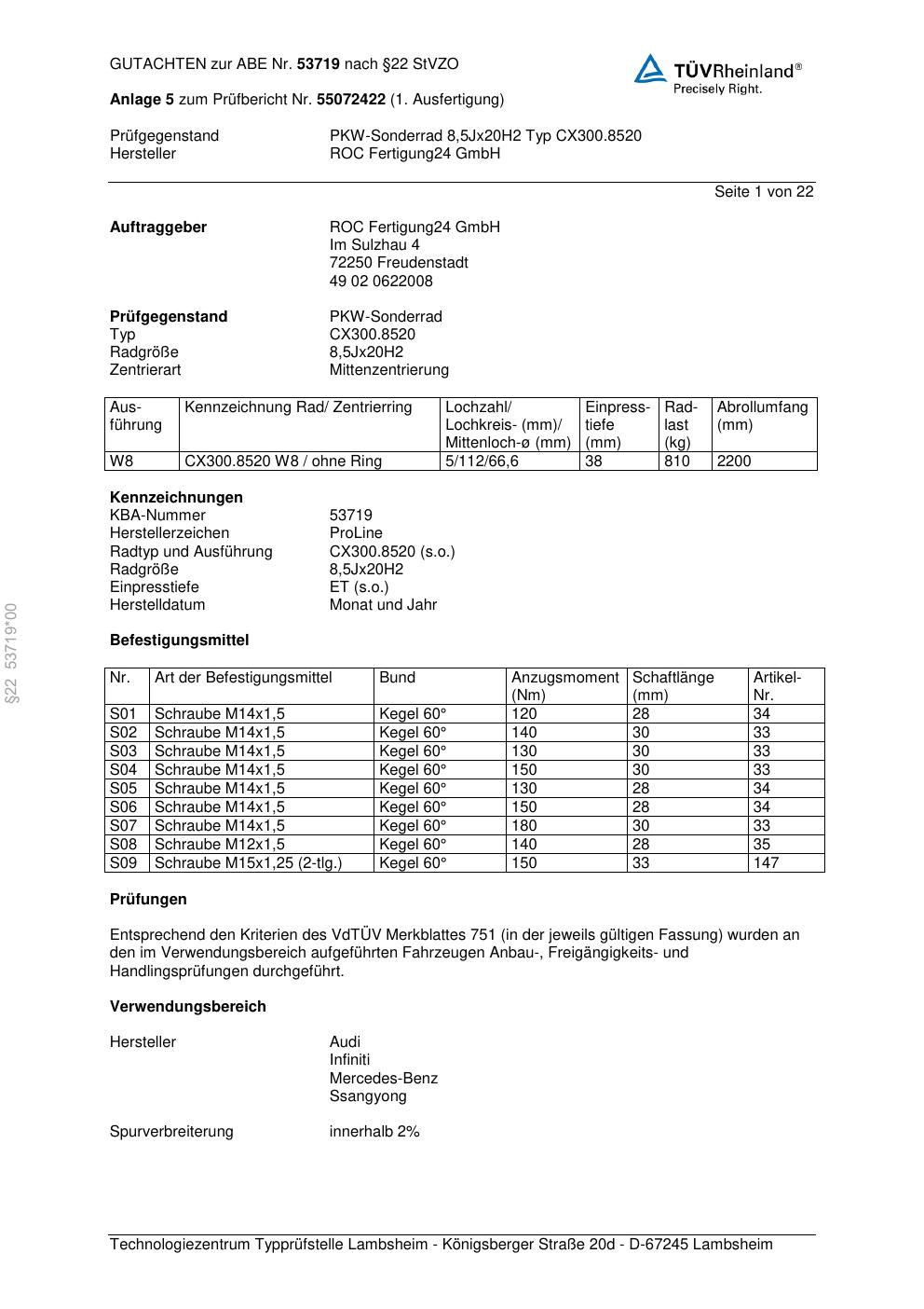 Felgengutachten / ABE für Alufelgen Proline CX300.85 (8.5Jx2 ET 0, Mittenloch 0 mm) mit KBA 53719 (Zertifikatsnummer KBA 53719). Hier kostenlos als PDF herunterladen. Der Download-Link ist 24 Stunden gültig und kann bis zu zwei Mal verwendet werden.