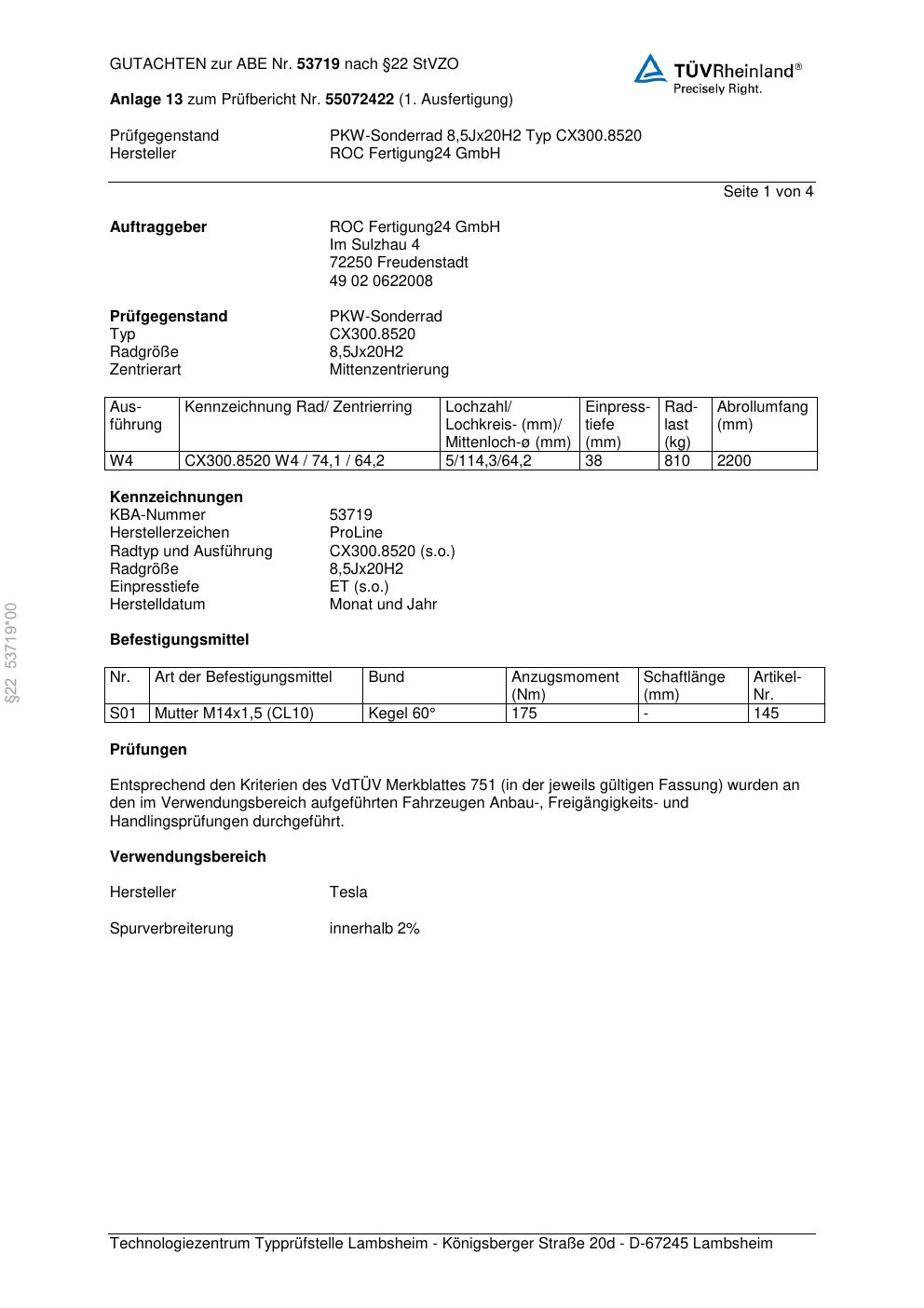Felgengutachten / ABE für Alufelgen Proline CX300.8520 (8.5Jx2 ET 0, Mittenloch 0 mm) mit KBA 53719 (Zertifikatsnummer KBA 53719). Hier kostenlos als PDF herunterladen. Der Download-Link ist 24 Stunden gültig und kann bis zu zwei Mal verwendet werden.