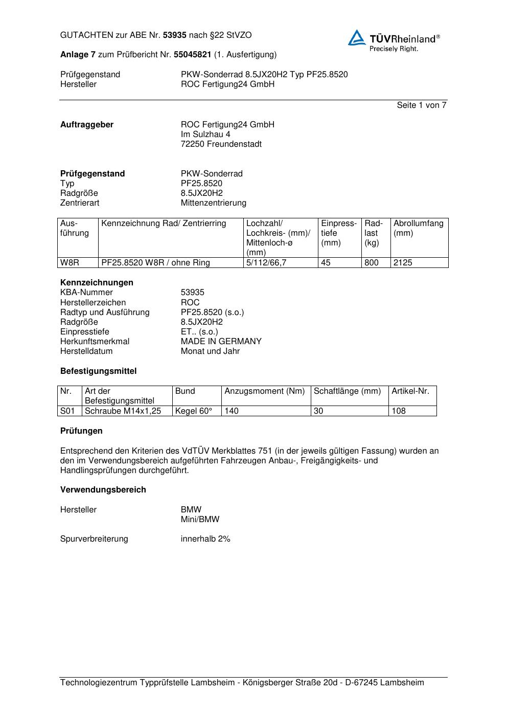 Dieses Gutachten (ABE) bezieht sich auf die Alufelge Proline PF25.8520 in der Ausführung 8.5Jx2 ET 0, Mittenloch 0 mm (KBA 53935). Im PDF findest du typischerweise zulässige Reifengrößen, Auflagen/Anbauhinweise und – je nach Dokument – Hinweise zur Eintragung.