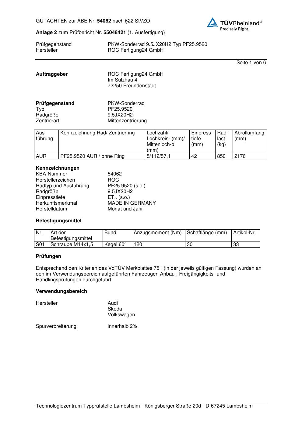 Felgengutachten / ABE für Alufelgen Proline PF25.9520 (9.5Jx2 ET 0, Mittenloch 0 mm) mit KBA 54062 (Zertifikatsnummer KBA 54062). Hier kostenlos als PDF herunterladen. Der Download-Link ist 24 Stunden gültig und kann bis zu zwei Mal verwendet werden.
