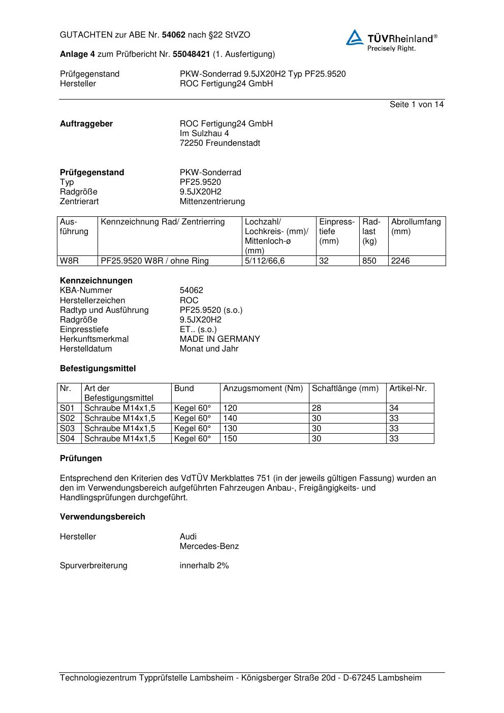Felgengutachten / ABE für Alufelgen Proline PF25.9520 (9.5Jx2 ET 0, Mittenloch 0 mm) mit KBA 54062 (Zertifikatsnummer KBA 54062). Hier kostenlos als PDF herunterladen. Der Download-Link ist 24 Stunden gültig und kann bis zu zwei Mal verwendet werden.