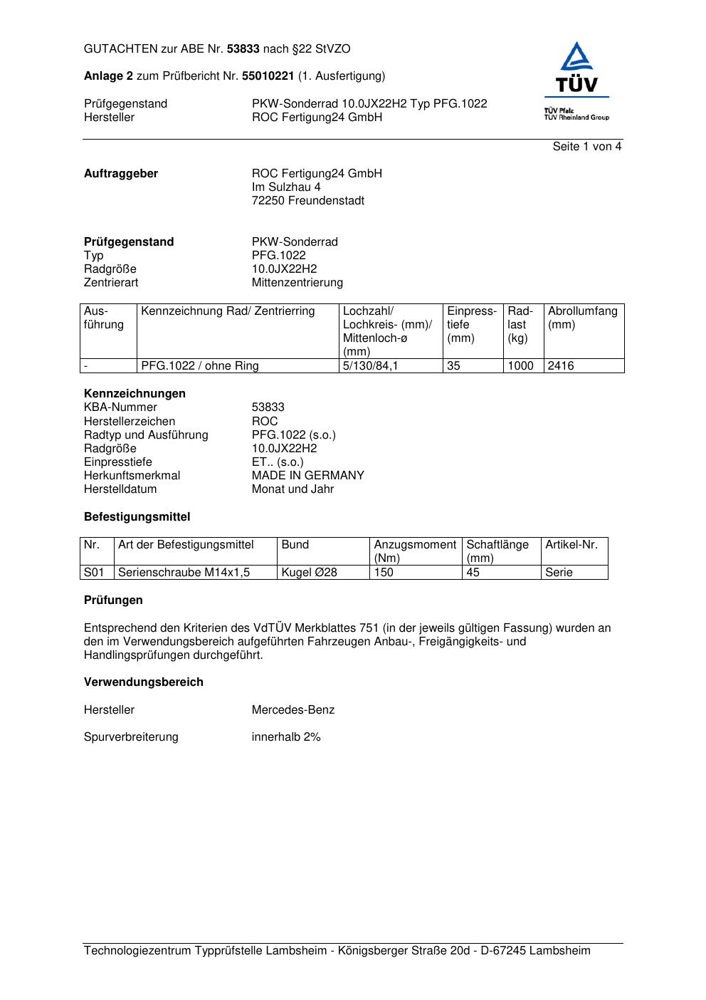 Dieses Gutachten (ABE) bezieht sich auf die Alufelge Proline PFG.1022 in der Ausführung 10Jx22 ET 0, Mittenloch 0 mm (KBA 53833). Im PDF findest du typischerweise zulässige Reifengrößen, Auflagen/Anbauhinweise und – je nach Dokument – Hinweise zur Eintragung.
