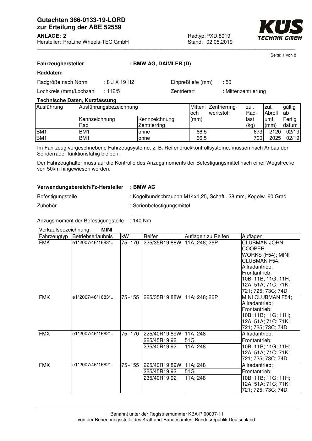Felgengutachten / ABE für Alufelgen Proline PXD.8019 (8Jx19 ET 0, Mittenloch 0 mm) mit KBA 52559 (Zertifikatsnummer KBA 52559). Hier kostenlos als PDF herunterladen. Der Download-Link ist 24 Stunden gültig und kann bis zu zwei Mal verwendet werden.