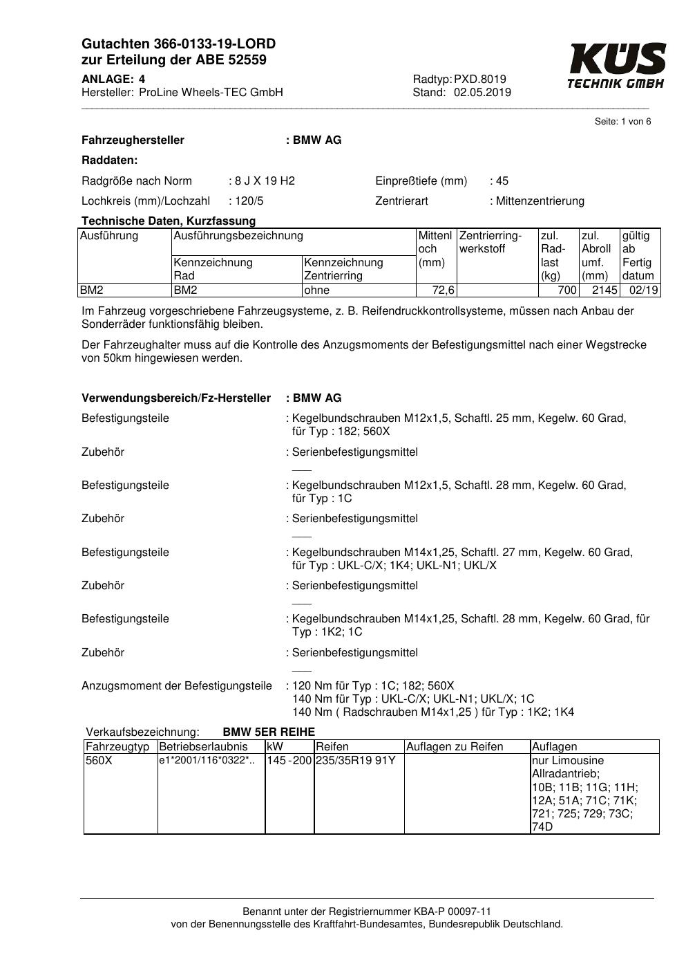 Felgengutachten / ABE für Alufelgen Proline PXD.8019 (8Jx19 ET 0, Mittenloch 0 mm) mit KBA 52559 (Zertifikatsnummer KBA 52559). Hier kostenlos als PDF herunterladen. Der Download-Link ist 24 Stunden gültig und kann bis zu zwei Mal verwendet werden.