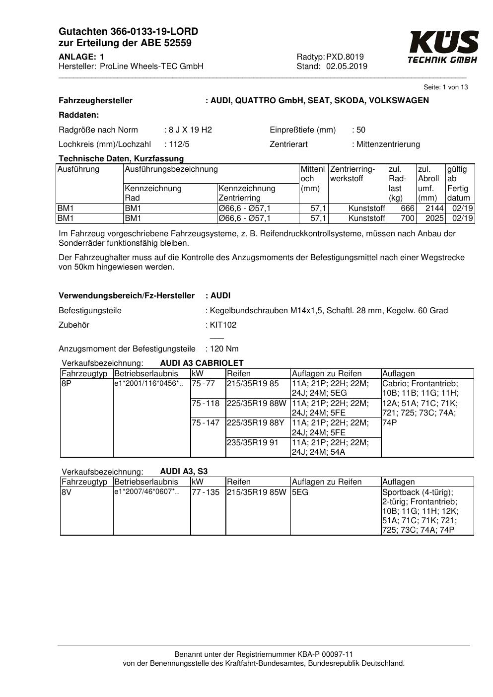Felgengutachten / ABE für Alufelgen Proline PXD.8019 (8Jx19 ET 0, Mittenloch 0 mm) mit KBA 52559 (Zertifikatsnummer KBA 52559). Hier kostenlos als PDF herunterladen. Der Download-Link ist 24 Stunden gültig und kann bis zu zwei Mal verwendet werden.