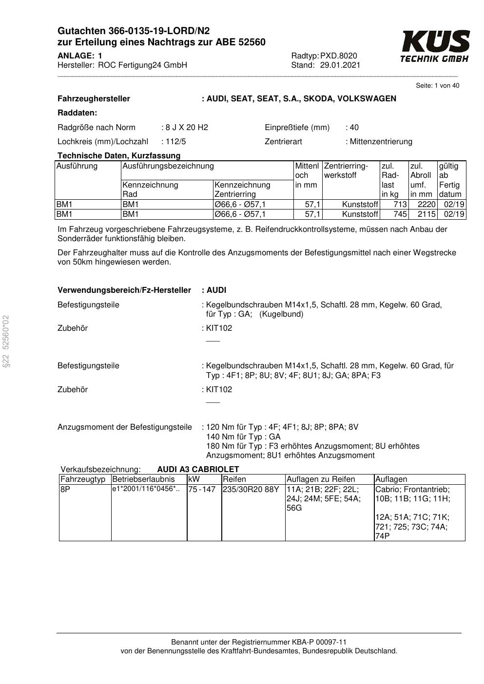 Felgengutachten / ABE für Alufelgen Proline PXD.8020 (8Jx2 ET 0, Mittenloch 0 mm) mit KBA 52560 (Zertifikatsnummer KBA 52560). Hier kostenlos als PDF herunterladen. Der Download-Link ist 24 Stunden gültig und kann bis zu zwei Mal verwendet werden.