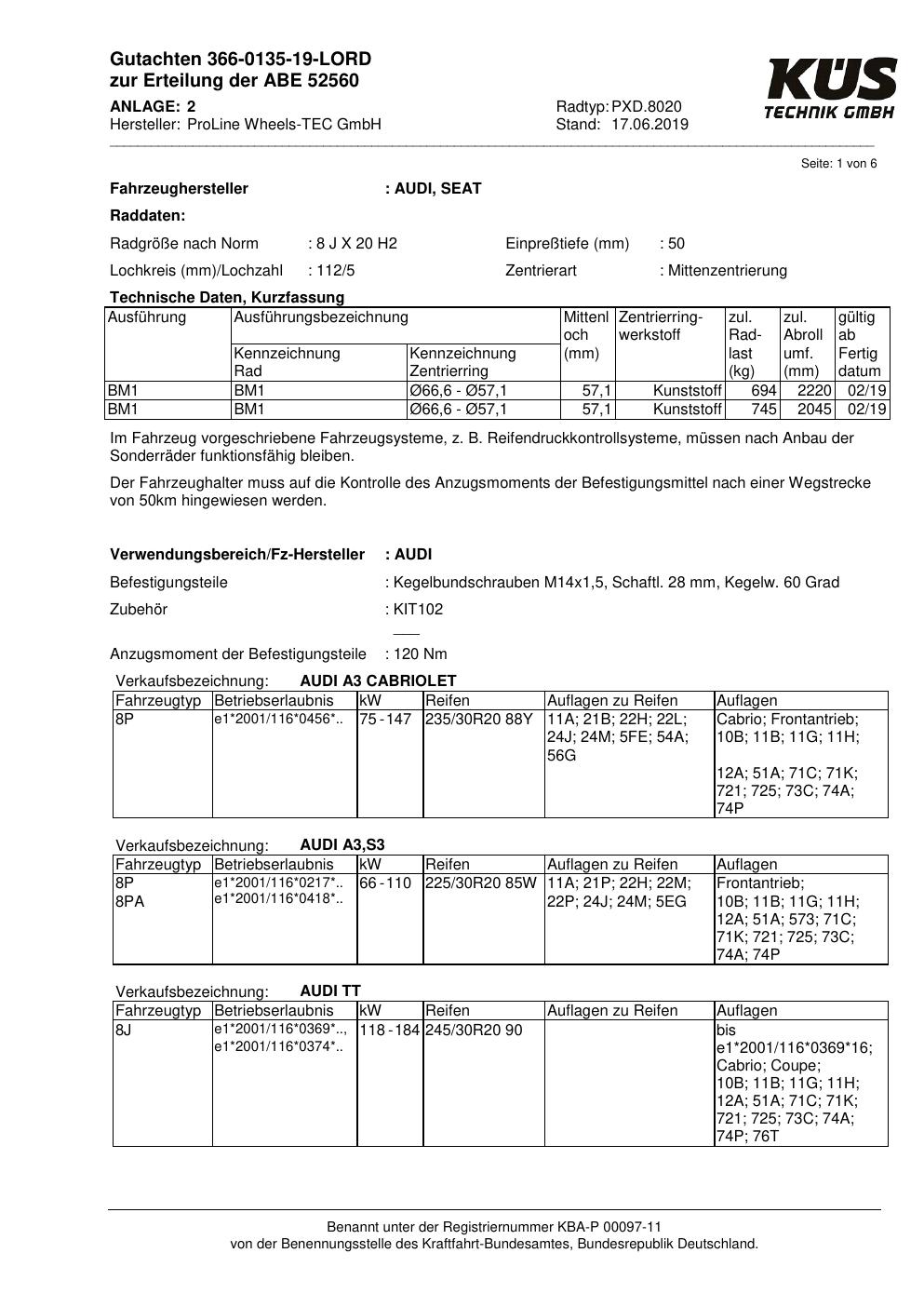 Felgengutachten / ABE für Alufelgen Proline PXD.8020 (8Jx2 ET 0, Mittenloch 0 mm) mit KBA 52560 (Zertifikatsnummer KBA 52560). Hier kostenlos als PDF herunterladen. Der Download-Link ist 24 Stunden gültig und kann bis zu zwei Mal verwendet werden.