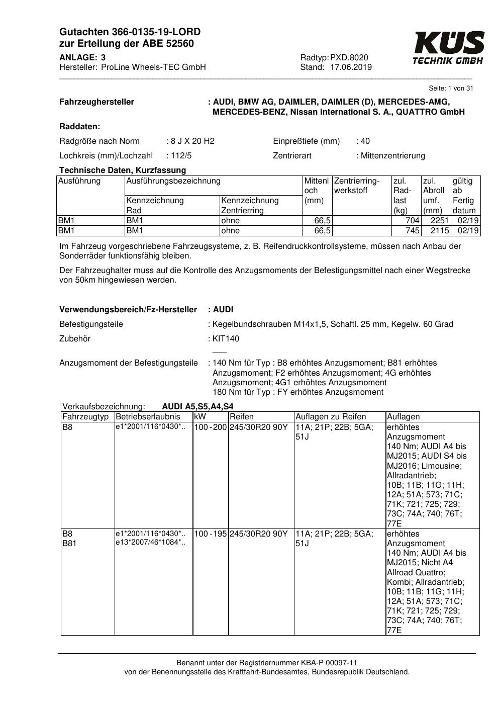 Felgengutachten / ABE für Alufelgen Proline PXD.8020 (8Jx2 ET 0, Mittenloch 0 mm) mit KBA 52560 (Zertifikatsnummer KBA 52560). Hier kostenlos als PDF herunterladen. Der Download-Link ist 24 Stunden gültig und kann bis zu zwei Mal verwendet werden.