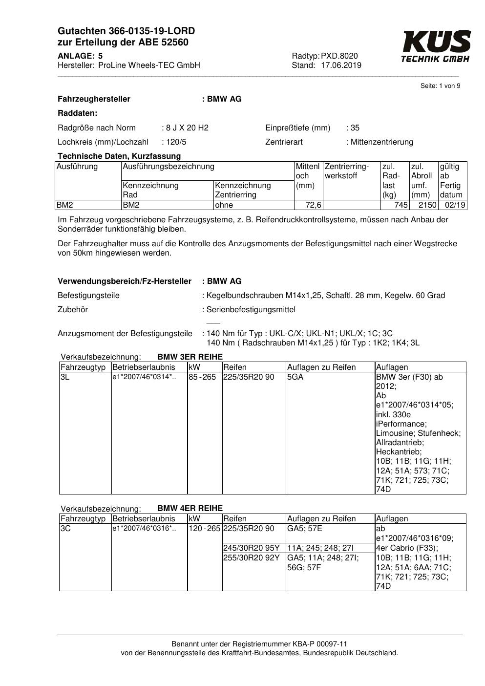 Felgengutachten / ABE für Alufelgen Proline PXD.8020 (8Jx2 ET 0, Mittenloch 0 mm) mit KBA 52560 (Zertifikatsnummer KBA 52560). Hier kostenlos als PDF herunterladen. Der Download-Link ist 24 Stunden gültig und kann bis zu zwei Mal verwendet werden.